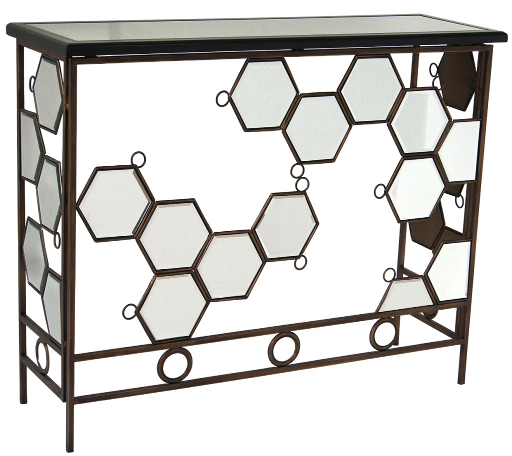 One of our newest spring items, the Diamond Console Table in Antique Bronze is a dramatic mirrored piece that packs a punch in any household.