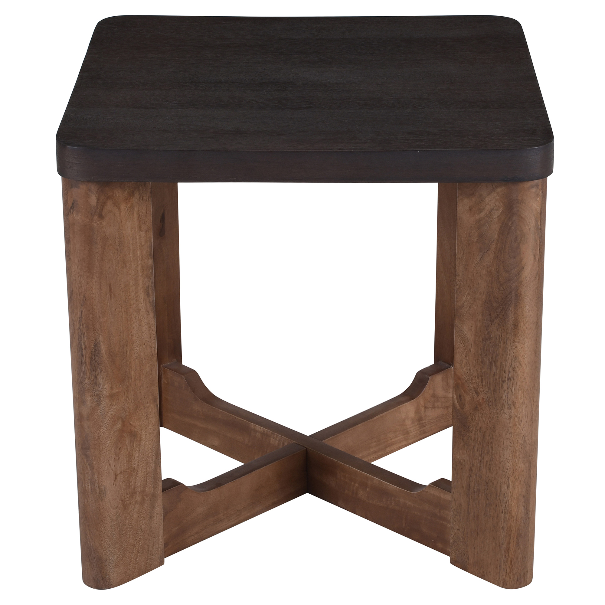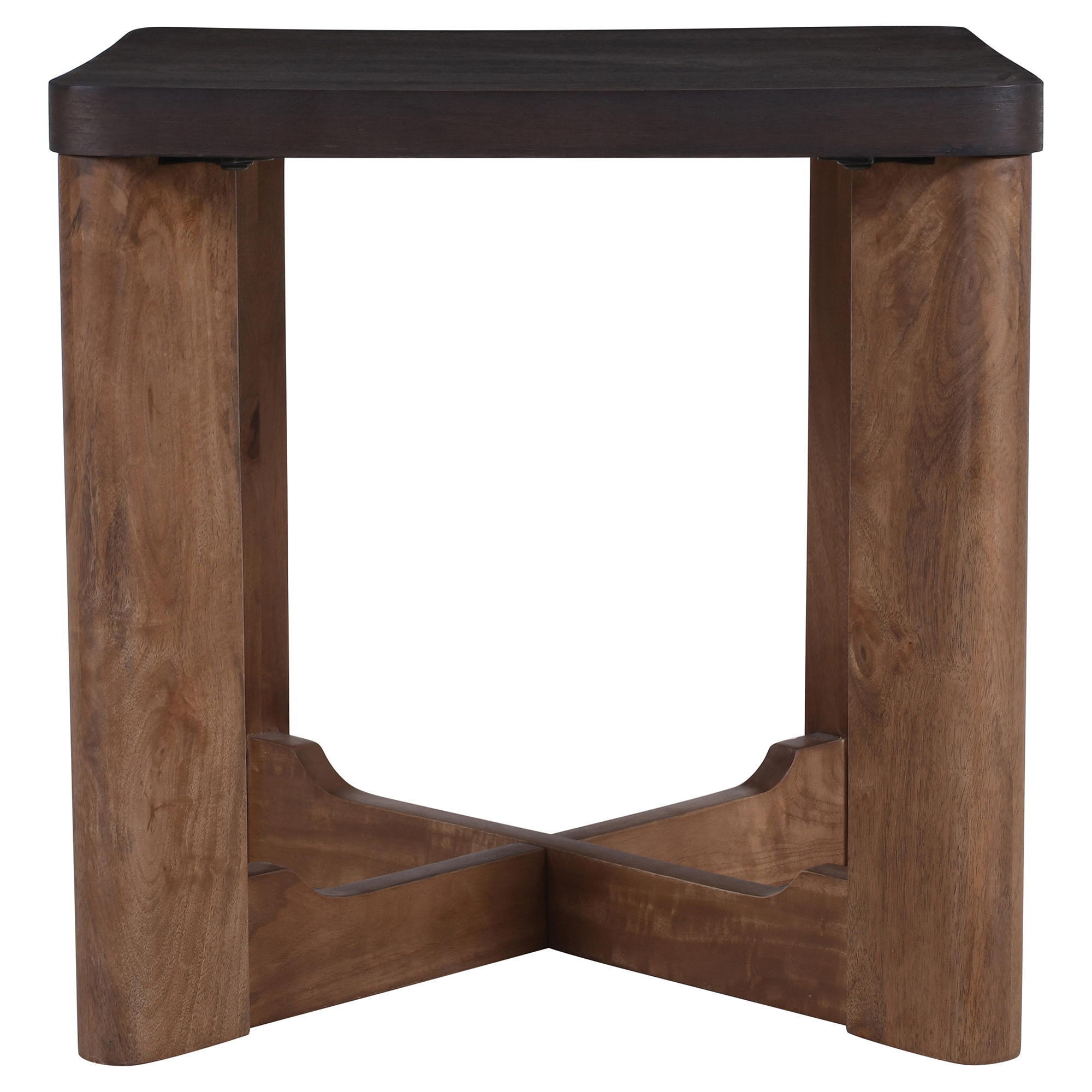Unique two-toned wood table, where the beauty of the mango wood grain shows through walnut and mocha finishes. The sturdy cross bases add visual interest and additional support to this beautiful piece. Use in the living room or as a bedside table.