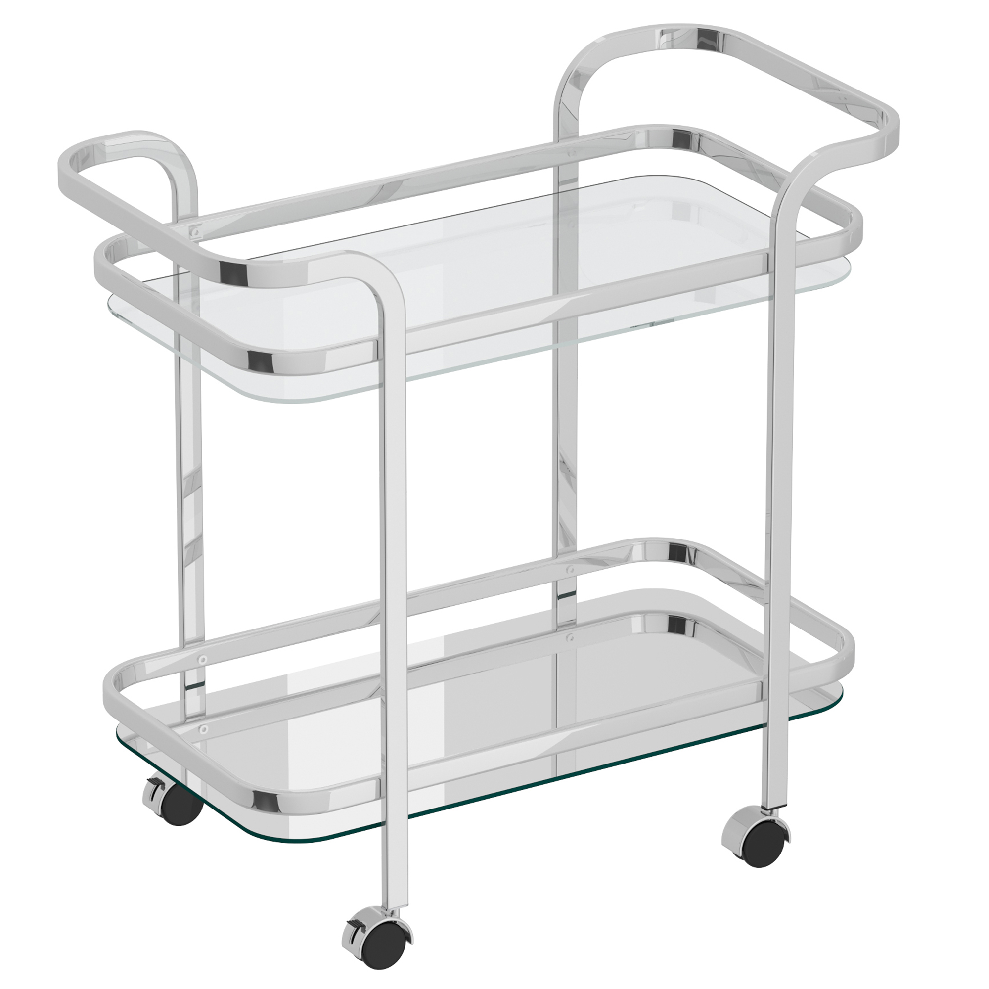 This 2-tier trolley is a functional furnishing with an edgy twist. Designed in a contemporary fashion, this chrome-finished piece has a top shelf that is outfitted with a 5mm-thick clear tempered glass shelf and a bottom shelf that has a 5mm-thick mirrored glass bottom shelf. The incorporation of two varying shelf types allows you to see every facet of this trolley through its top while its mirrored bottom reflects giving the illusion of a larger, grander space. With plastic wheels that rotate 360 degrees allowing for full manoeuvrability and have a locking capability, this versatile trolley can be showcased from every angle. Whether you're serving up the cocktail of the hour or hors d'oeuvres fresh out of the oven, this trolley will be the highlight of the night.