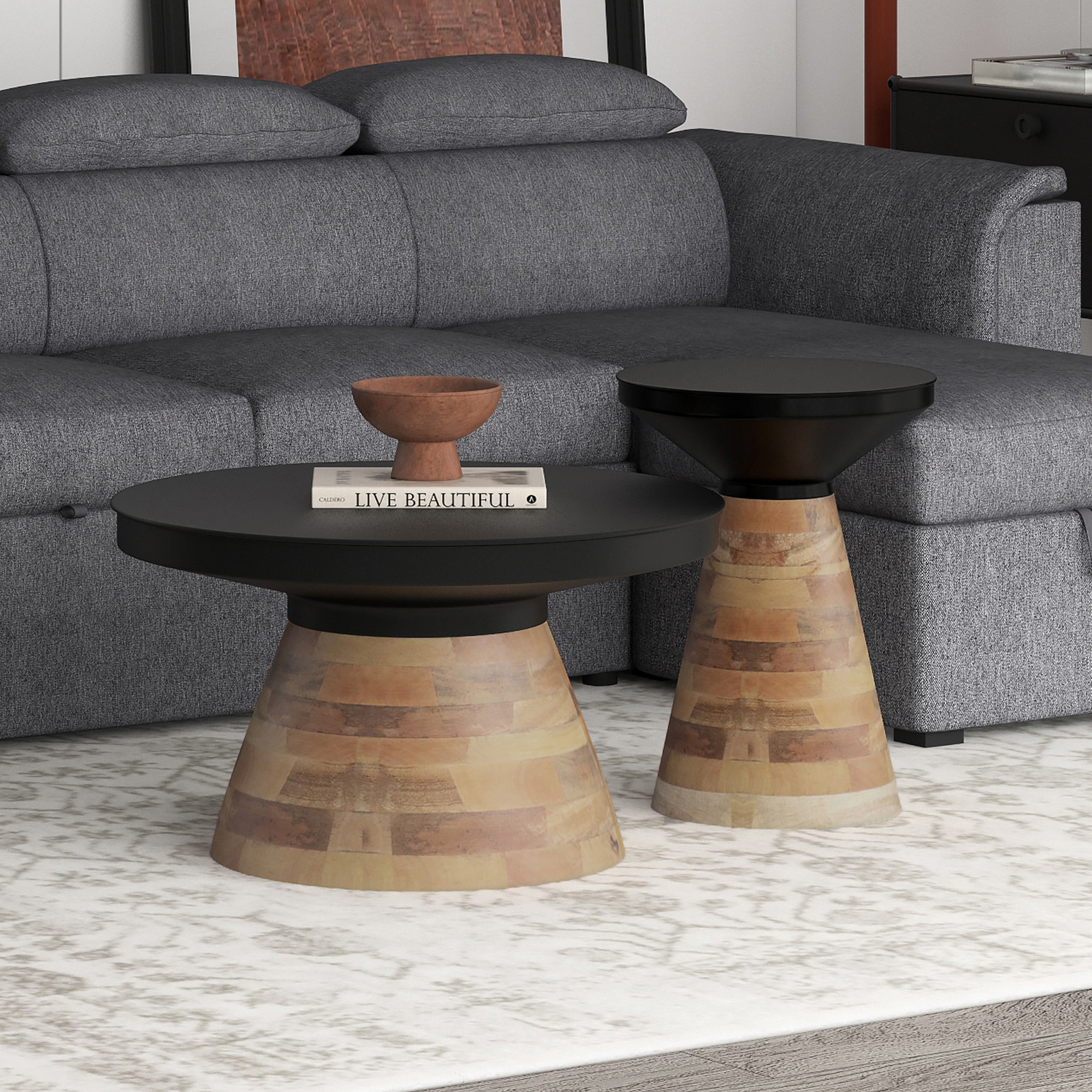 Boden 2pc Round Coffee Table Set in Black and Walnut
