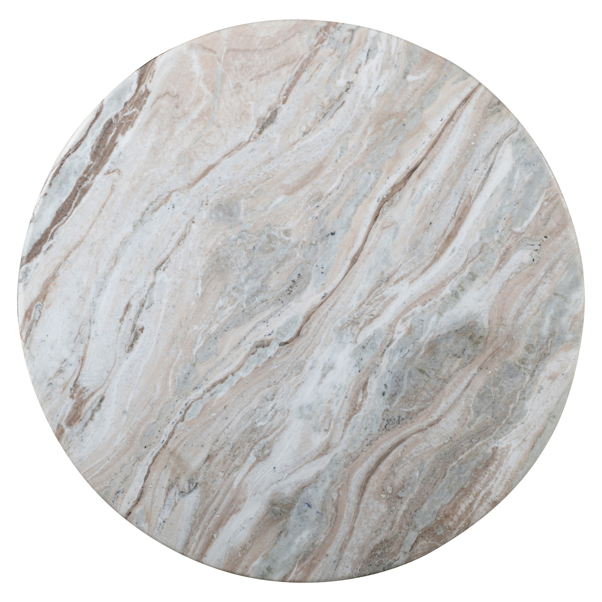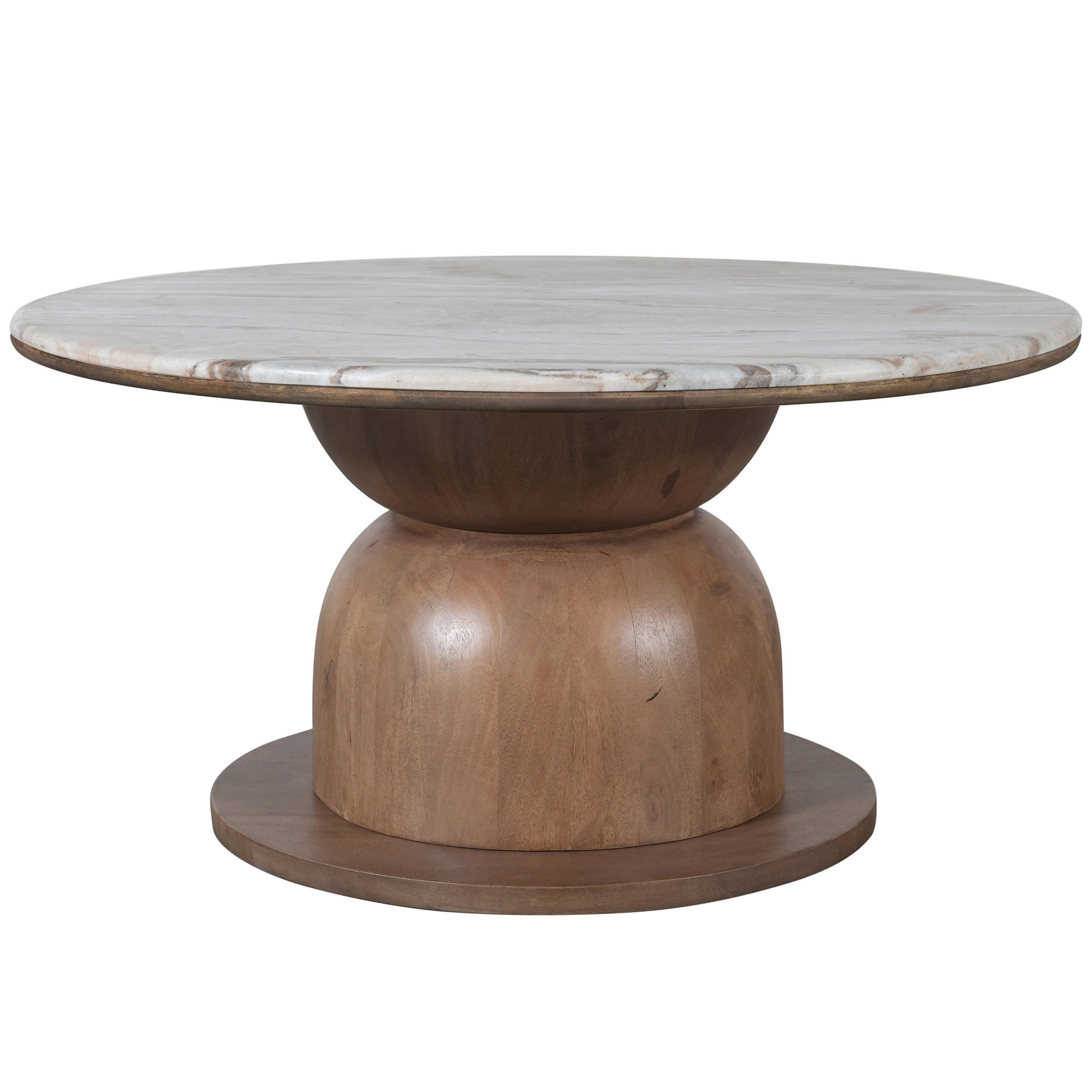 A sculptural solid wood pedestal base table with a rounded column and wide circular plinth, offering a balanced, architectural foundation. Topped with a marble slab top - Fantasy Brown has swirls of cream, grey, light and dark brown. Perfect for formal or casual living spaces, a true centrepiece.