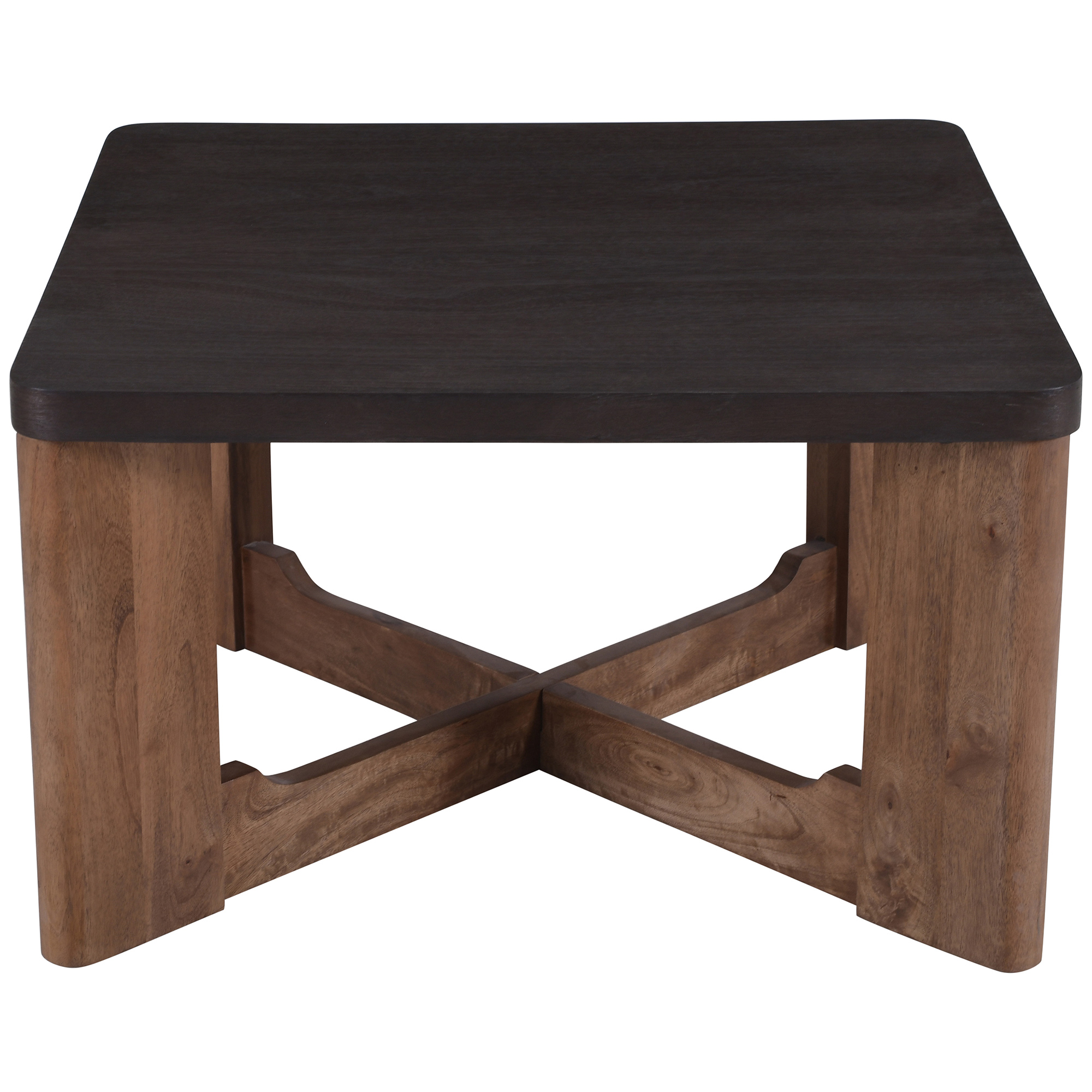 Unique two-toned wood table, where the beauty of the mango wood grain shows through walnut and mocha finishes. The sturdy cross bases add visual interest and additional support to this beautiful piece. Great for use in casual or formal living spaces.