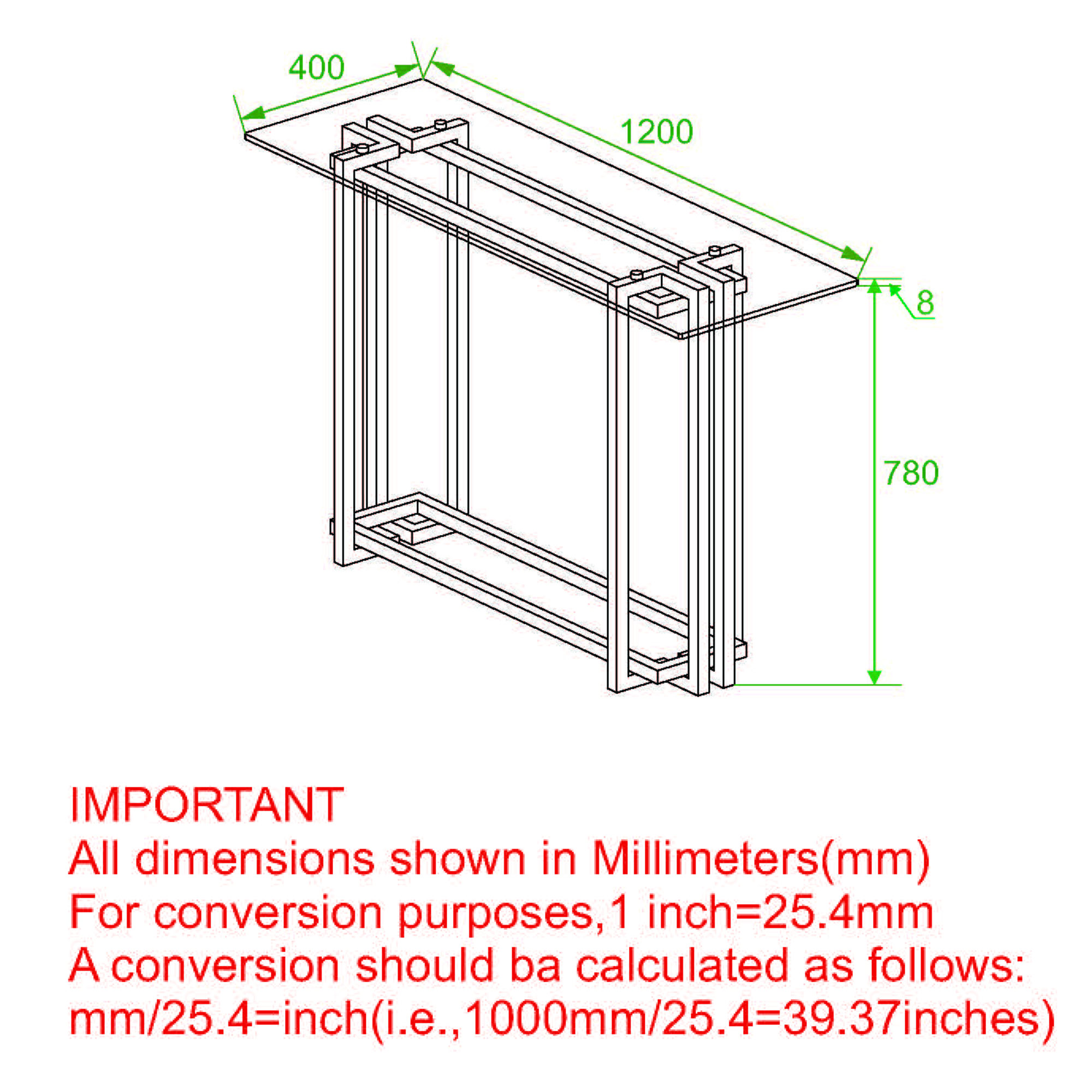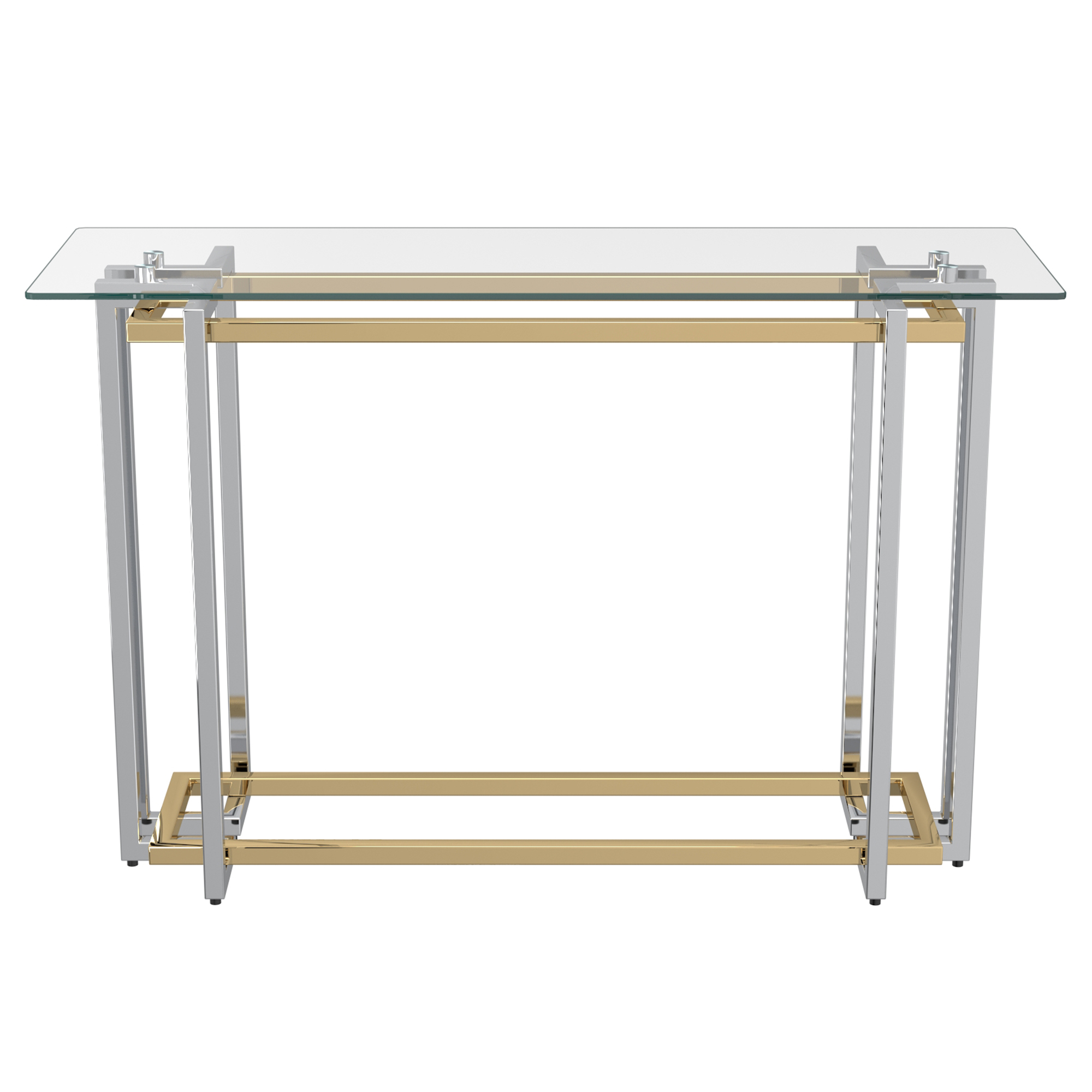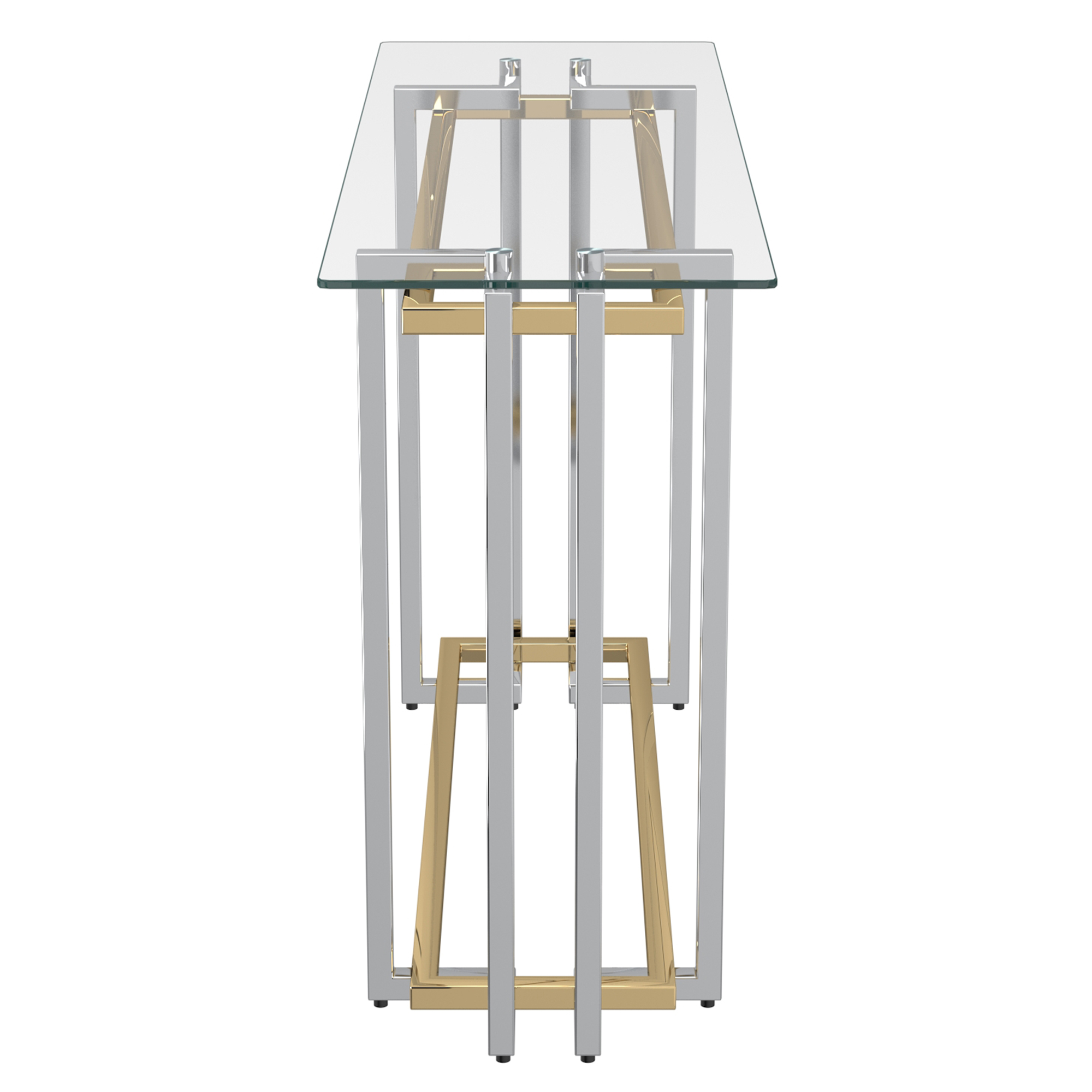 Stylish contemporary metal and glass console table with an interlaced gold and silver finish. The geometric design and the glass top gives this piece an airy look that will add beauty and function without being overbearing. Great as an accent piece behind a sofa, in a hallway or powder room.