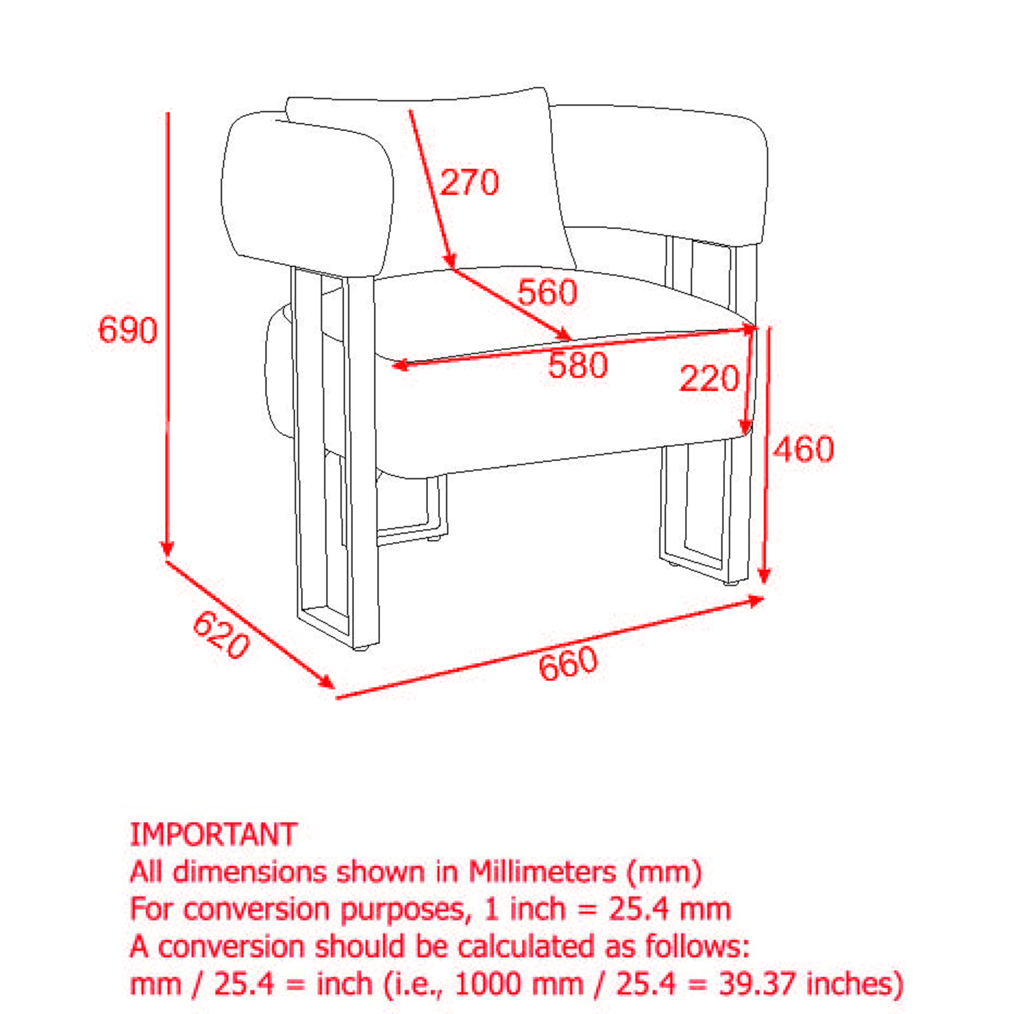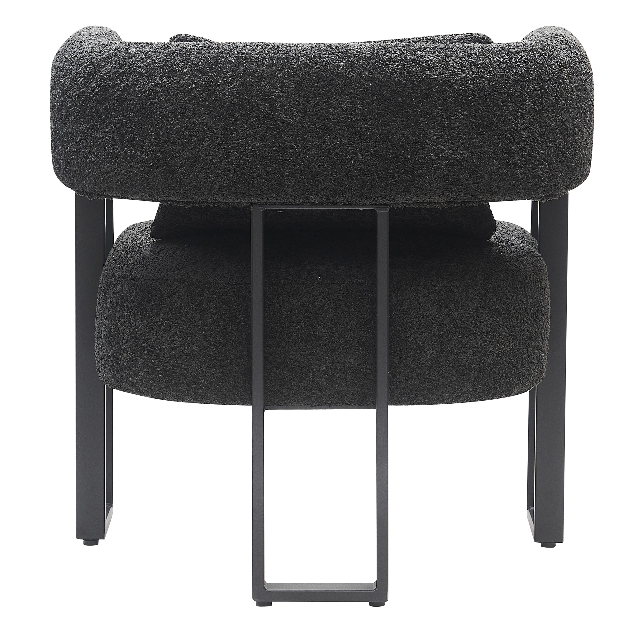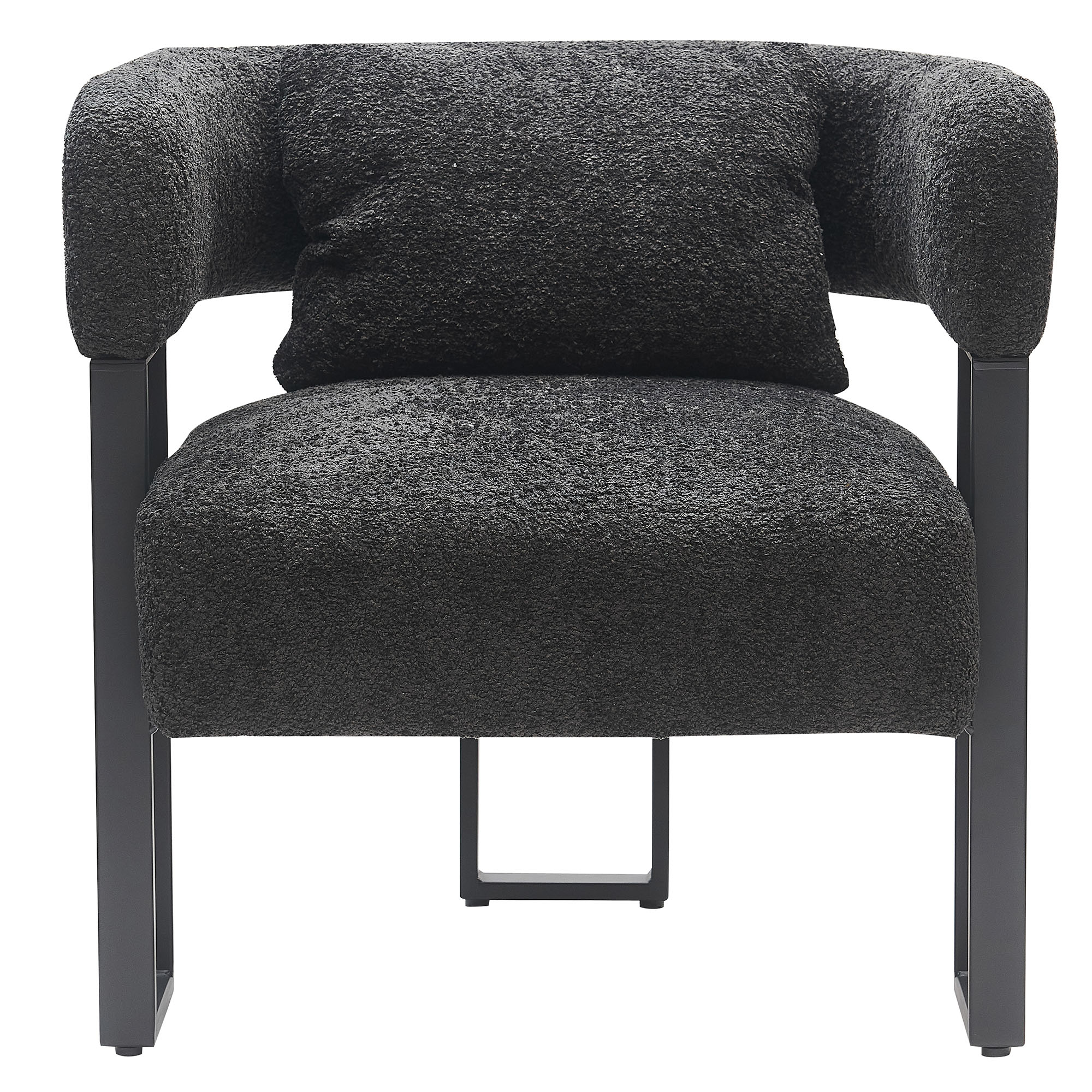 Modern bucket-style accent is the epitome of high-end designer style. The textured boucle fabric and the squared, black metal frame work perfectly with the contoured seat back to create the perfect accent seating. Matching throw pillow provides lumbar support or gives opportunity for mixing and matching with other fabrics in the room. Create a cosy conversation space in a formal living room, or place in a bedroom for a perfect reading chair.