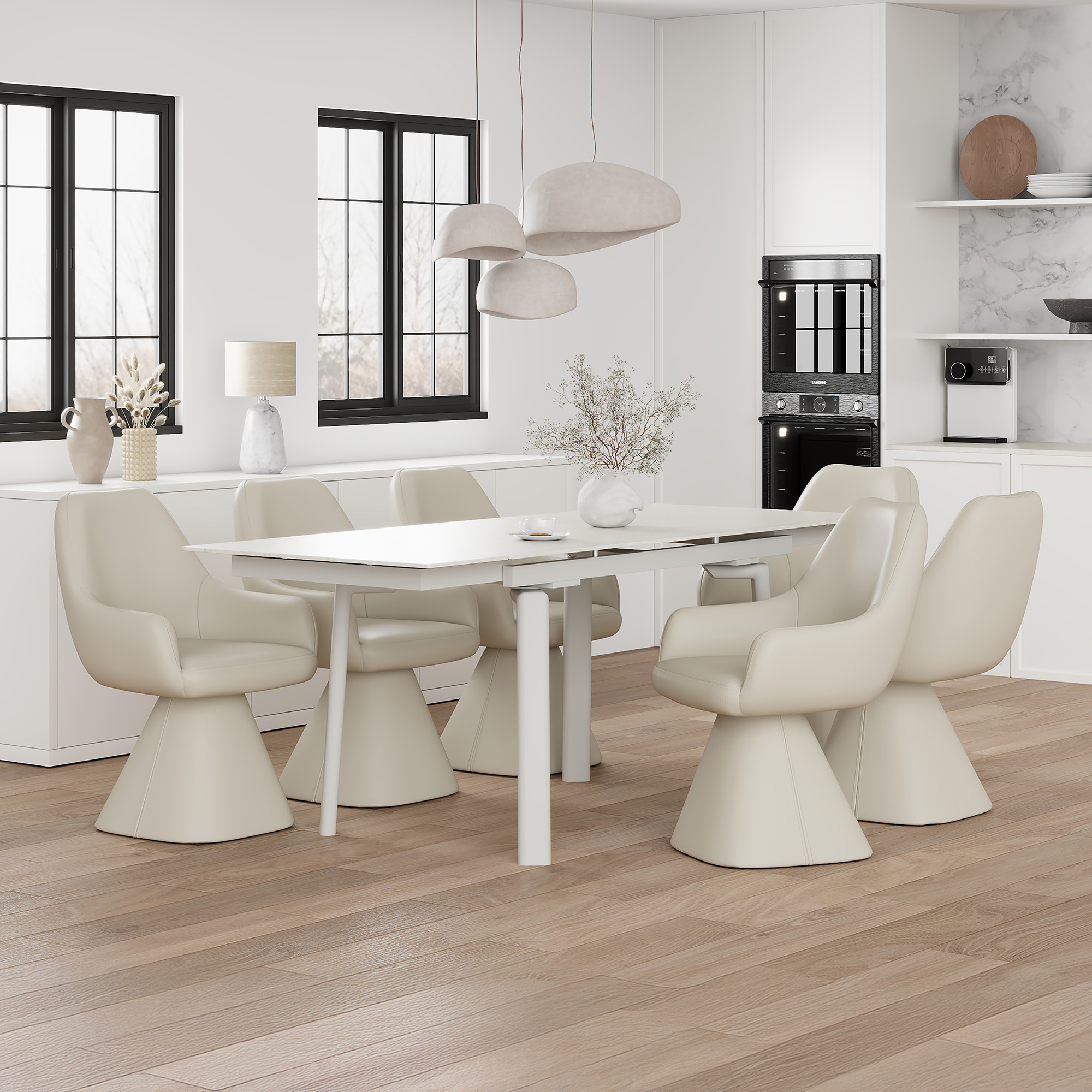 Expand your seating capacity without stress with the easy, pop-up extension leaves on this dining table. The sintered stone table is extremely durable, and sitting atop a cream-coloured metal base creates a gorgeous tone-on-tone look. Fully upholstered seat, back and base in a monochrome look that exudes elegance. The automatic return swivel seat adds another elevated element to the design of these gorgeous chairs and adds functionality to the piece. Perfect in a formal dining space, or to bring sophistication into your everyday dining.