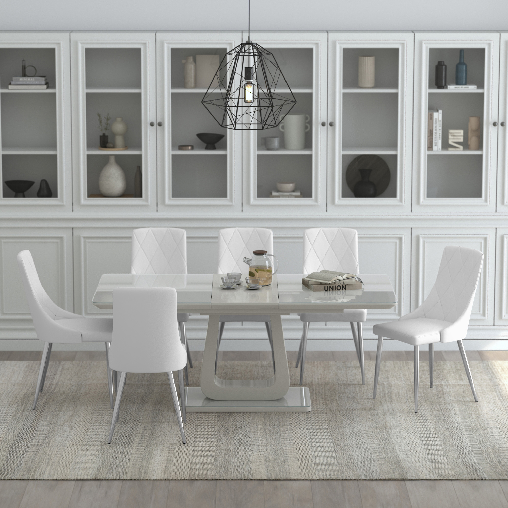 Corvus and Devo 7pc Dining Set - Warm Grey Table and White Chairs