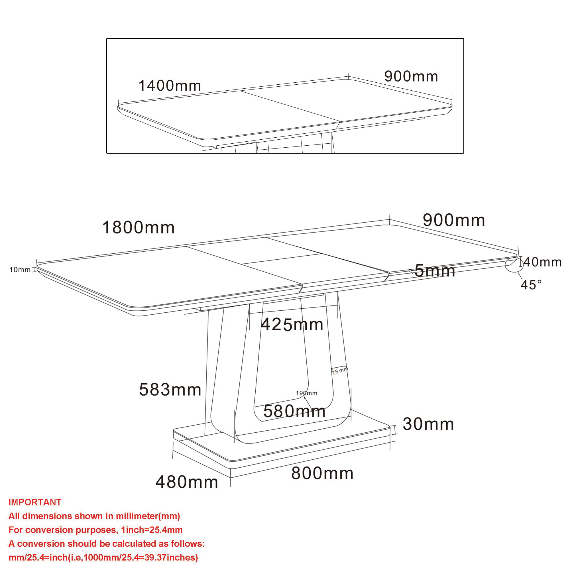 • 5mm tempered grey glass on table top and base plate; extension without glass creates a two-tone look on table top