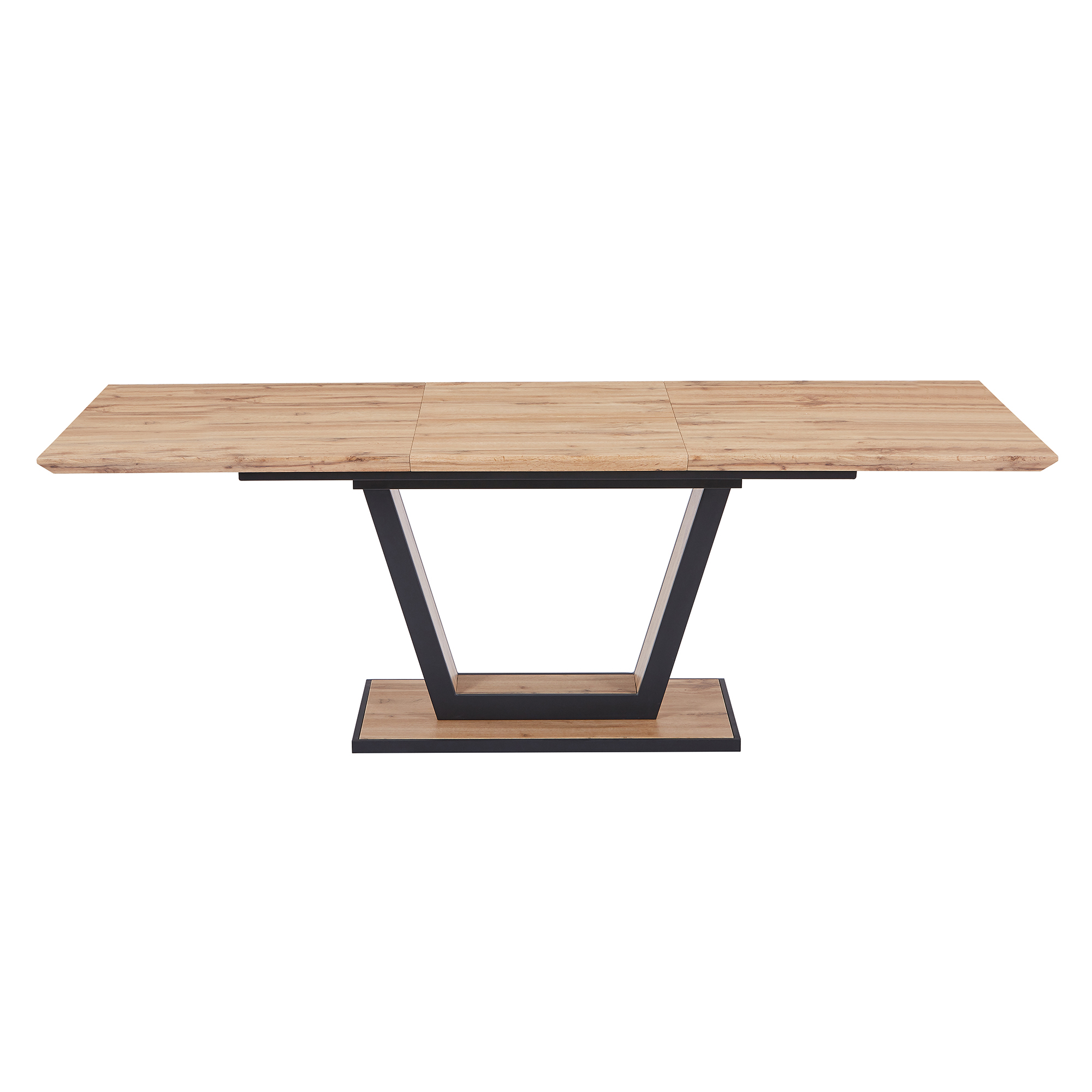 Natural wood grain and black metal detailing bring warmth to this geometric design table. Pair with a variety of chair colours and styles to create your perfect dining space. The one-handed extension mechanism is easy to use, allowing you to accommodate those last minute dinner guest with ease.