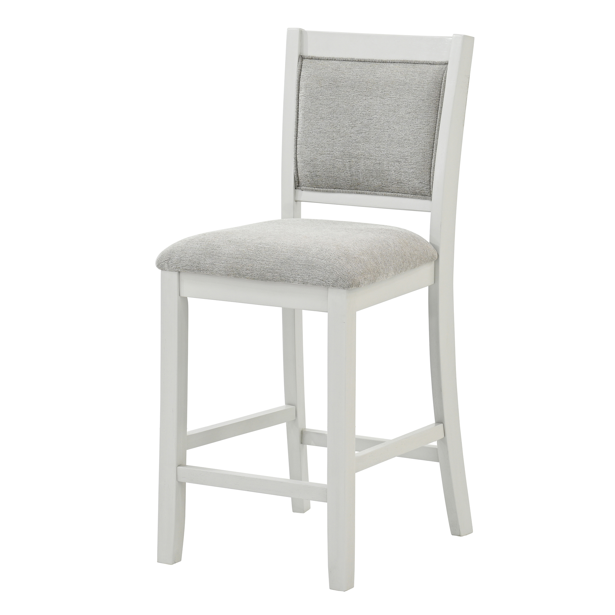 - Solid rubberwood stools in a whitewash finish with textured, warm grey fabric upholstery
