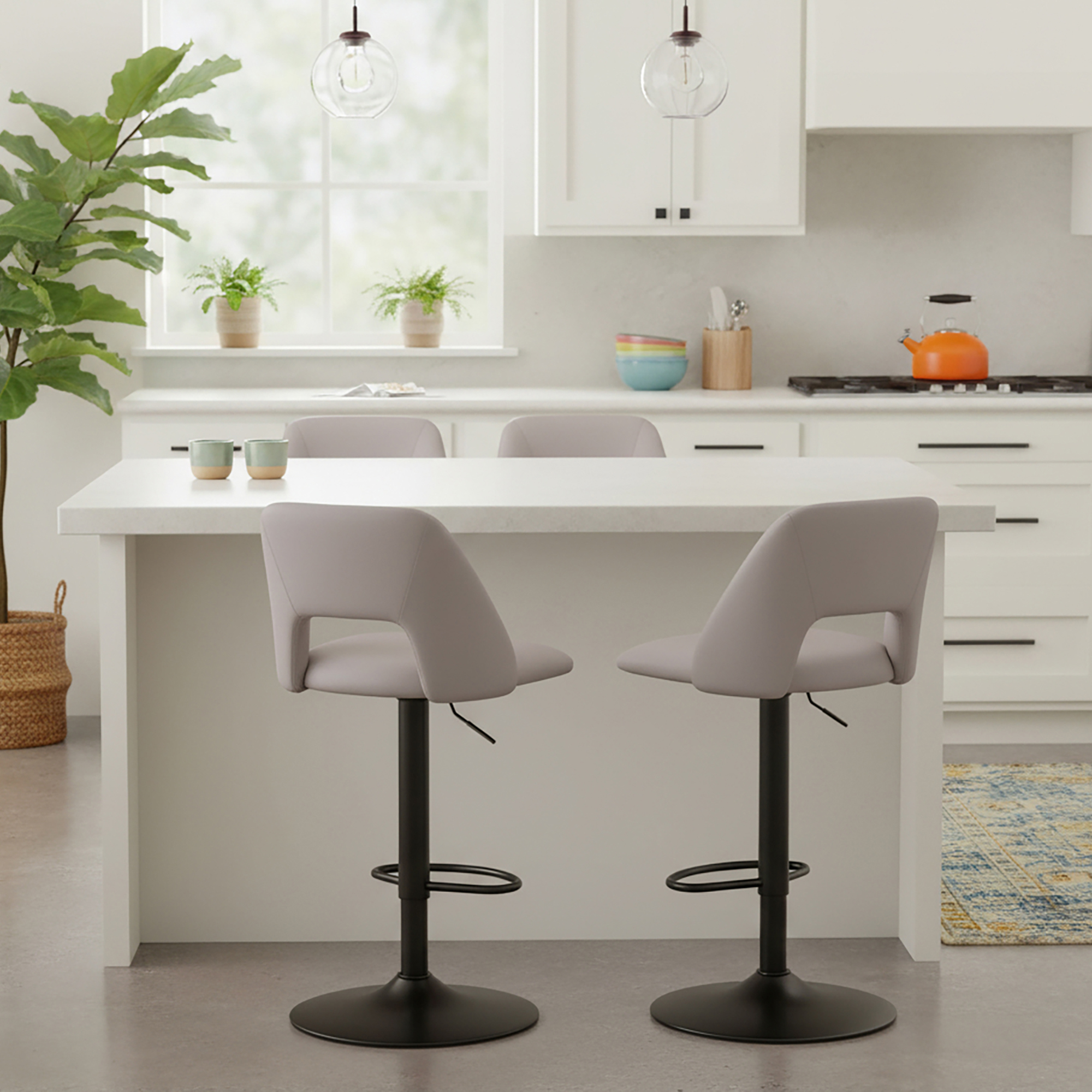 Wide, spacious seat and high-back with a cutout design – these stools are all about comfort and style! The adjustable height makes it easy to use for bar or counter heights. Easy-to-wipe faux leather upholstery and matte black post and base come together for a clean, simple look that will work in any décor space. Perfect for formal entertaining or casual, everyday kitchen seating.