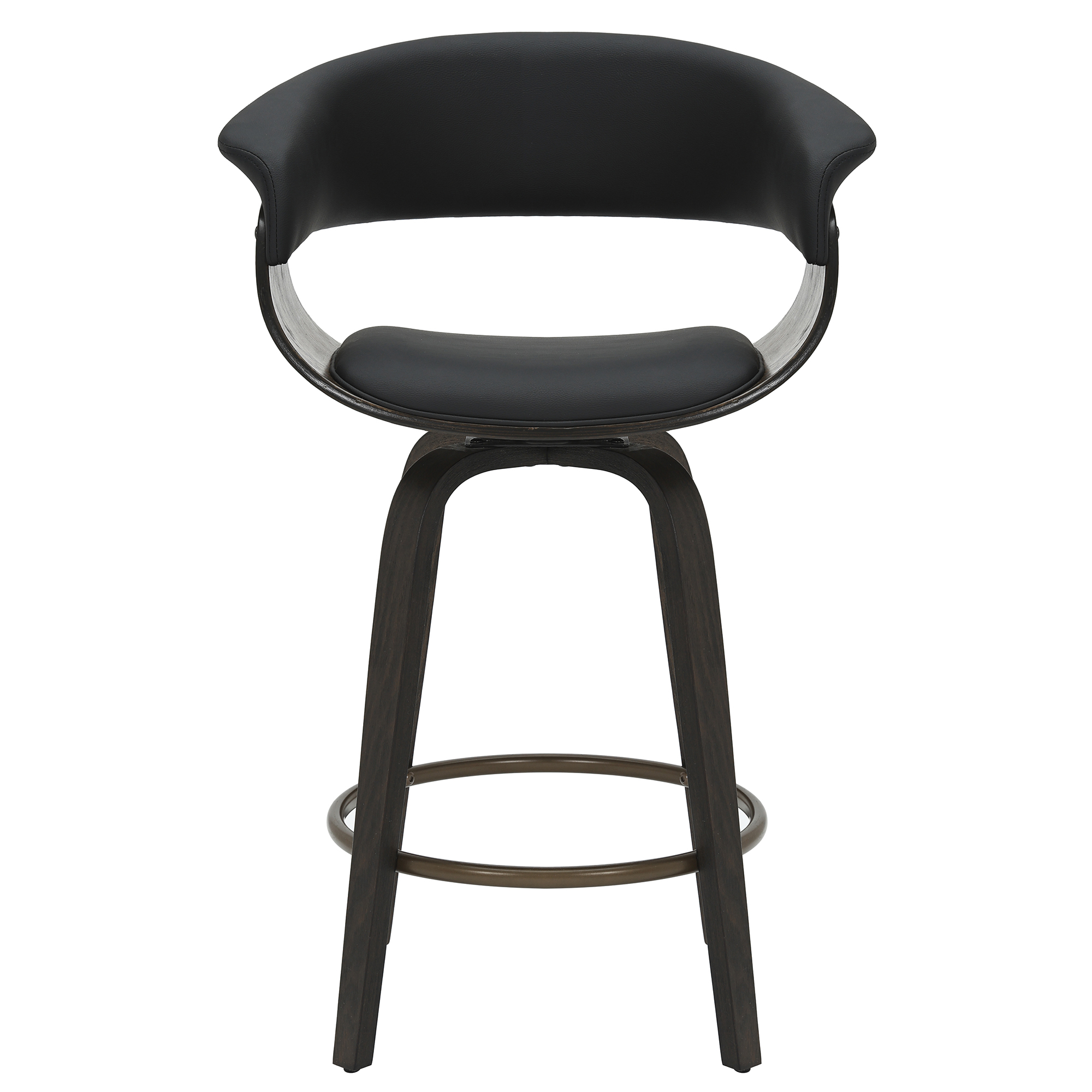 This mid-century style counter stool is crafted with a curved bentwood frame and legs in a dark walnut finish, and a black faux leather seat and back with piping details. The contoured back will envelope your body with plush elegance and the 360° swivel will ensure you can carry on a conversation in any direction. The aged gold footrest is the perfect finishing touch.