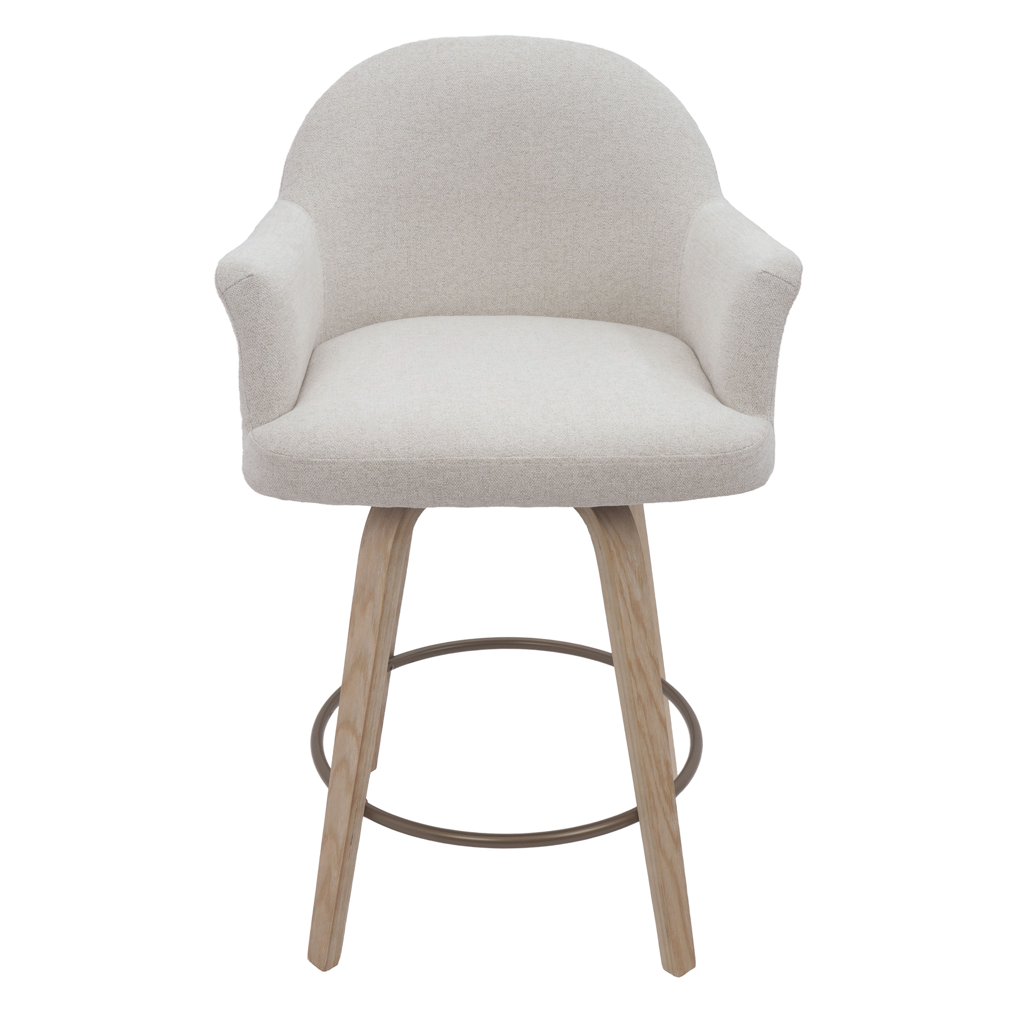 Modern and elegant, these counter-height stools have a full 360° swivel seat, with a soft, textured upholstery on the arms and seat. Perfect for leisurely breakfasts on the weekends or for the kids to do their homework while dinner is being prepped. Aged gold finish on the metal footrest and a soft chenille-like upholstery creates an elevated look for that perfect high-end piece.