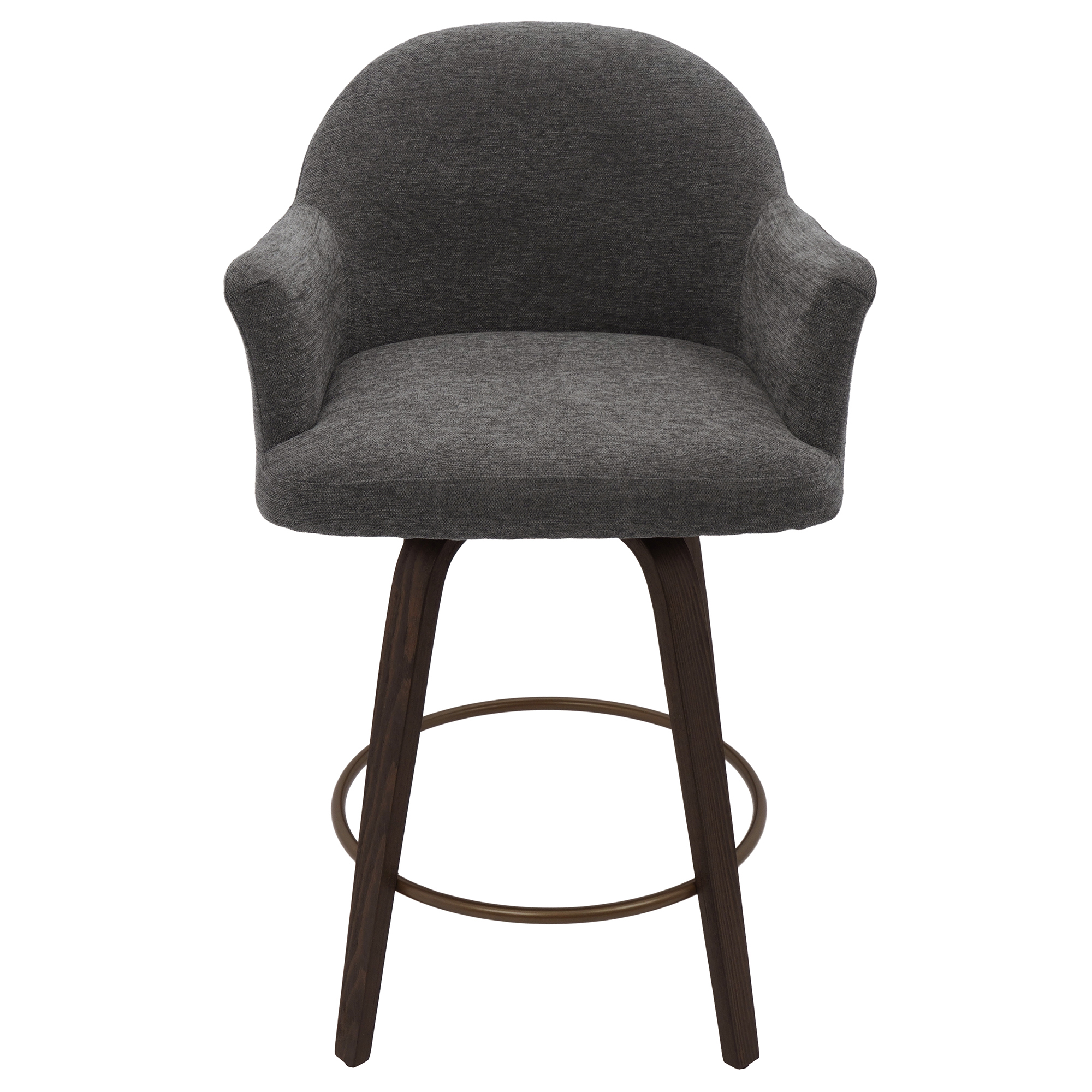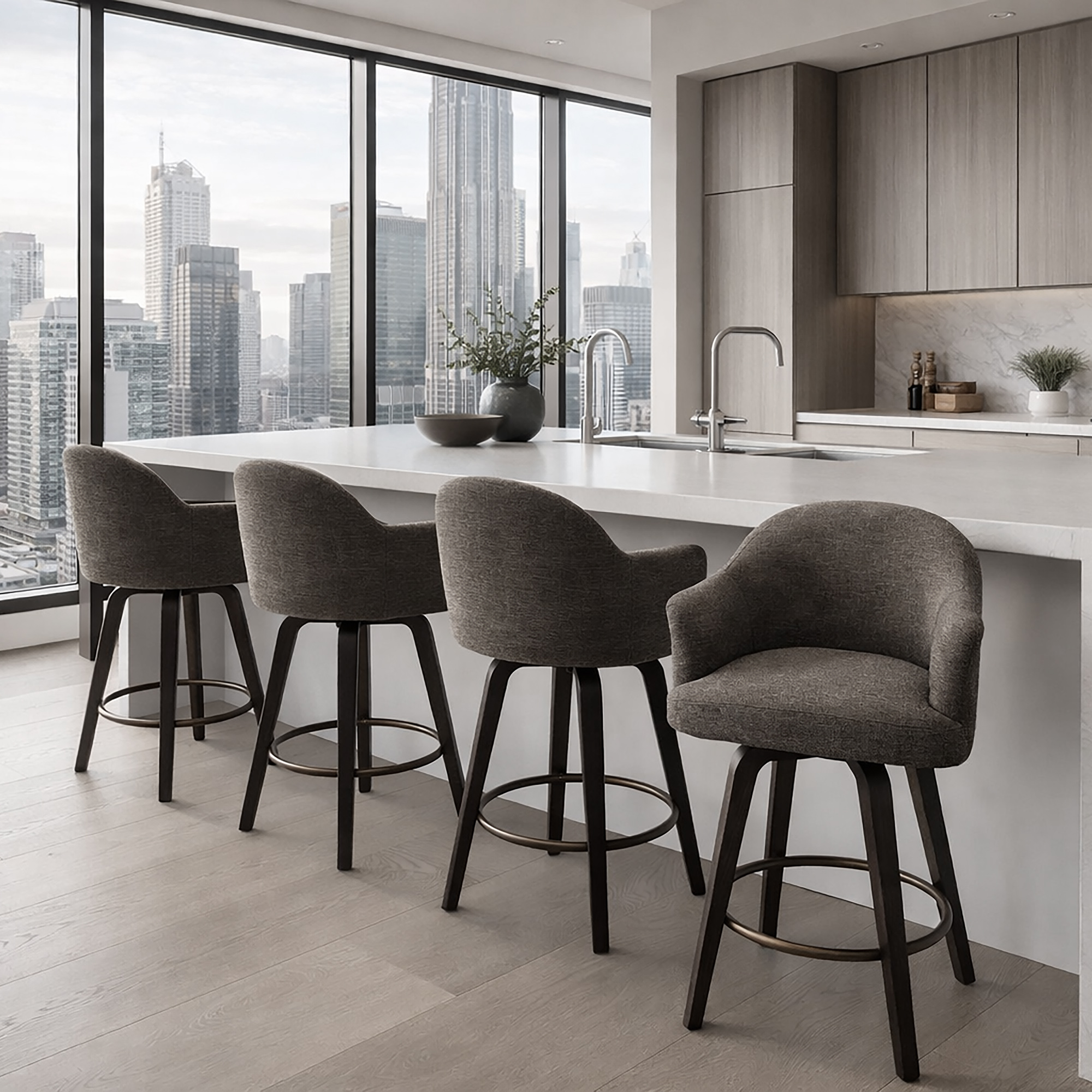 Modern and elegant, these counter-height stools have a full 360° swivel seat, with a soft, textured upholstery on the arms and seat. Perfect for leisurely breakfasts on the weekends or for the kids to do their homework while dinner is being prepped. Aged gold finish on the metal footrest and a soft chenille-like upholstery creates an elevated look for that perfect high-end piece.