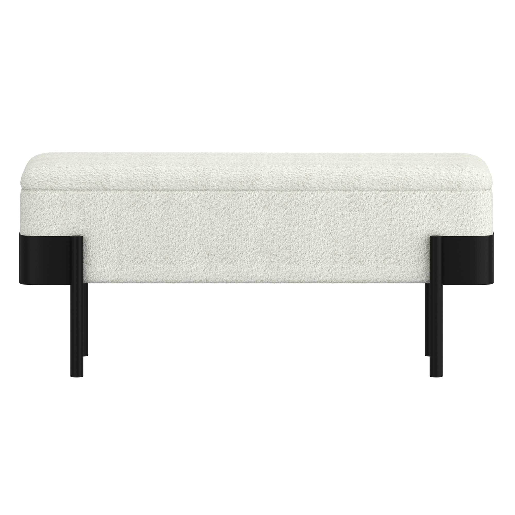 Add a touch of refined texture to your living space with this storage ottoman, a perfect blend of comfort and style. Upholstered in luxurious boucle fabric, the plush top invites you to sit or rest your feet in ultimate coziness. The ottoman's standout feature is the wrapped metal frame which adds a touch of modern craftsmanship. This piece is perfect as a bench for extra seating, or a stylish footrest that enhances any room and adds the convenient option of hidden storage.