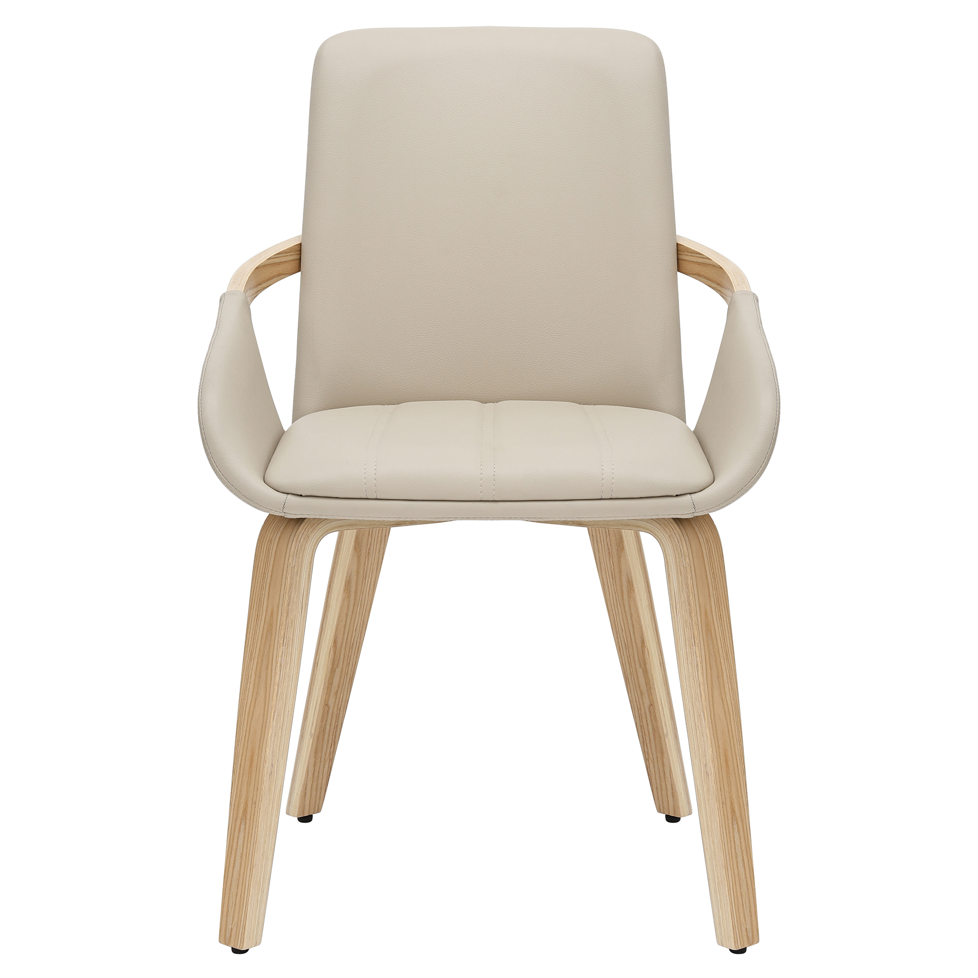 The wrap-around frame of this chair looks like it's reaching out to give you a warm embrace. Accept the invitation and take a seat on this comfortable beauty. The modern combination of the sand-toned faux leather and the natural-finished bentwood legs creates an elevated look. Matches well with a variety of dining table styles and colours.