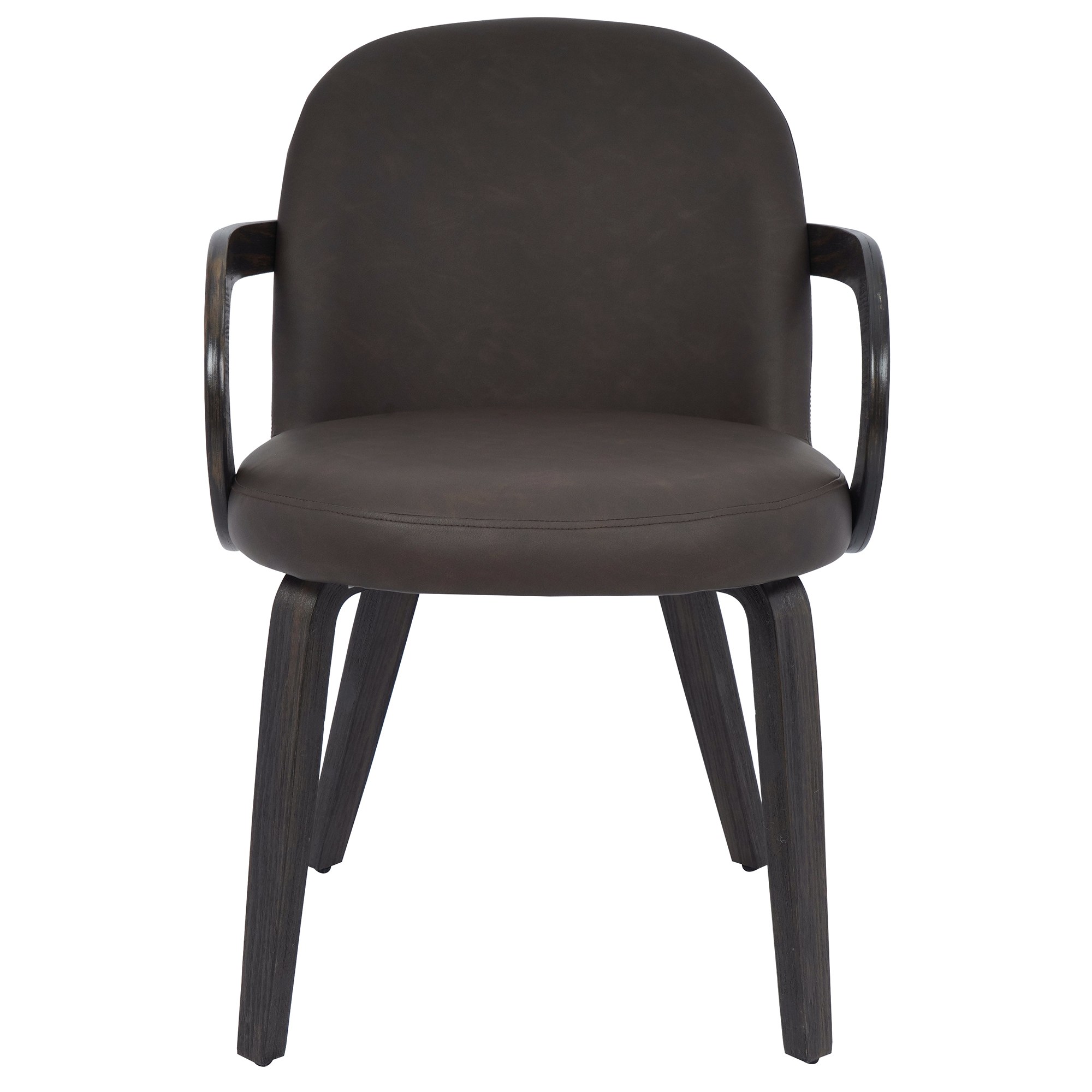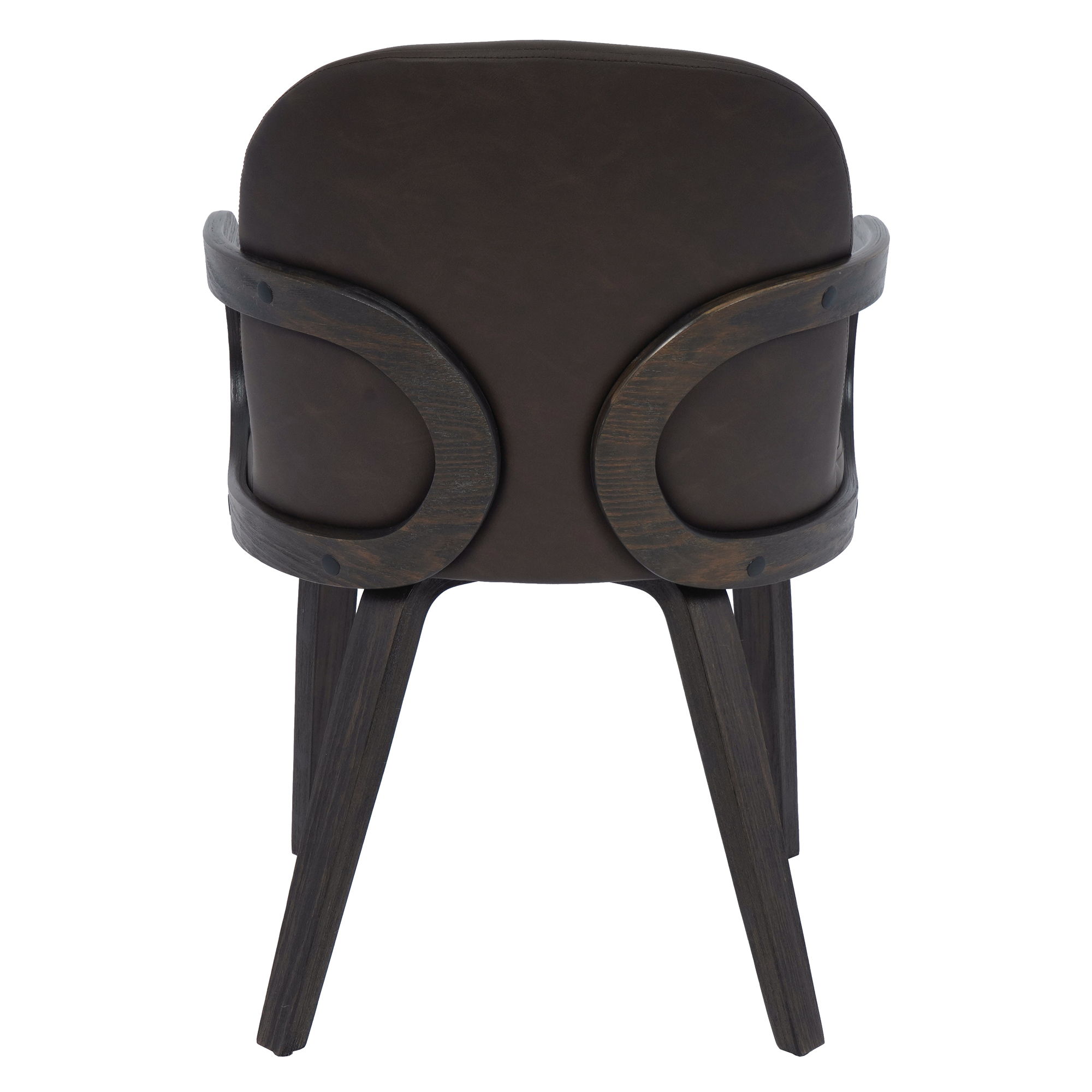 The wrap-around frame of this chair looks like it's reaching out to give you a warm embrace. Accept the invitation and take a seat on this comfortable beauty. The gorgeous combination of the dark brown, vintage faux leather with the dark walnut bentwood frame and legs rings a modern touch to this mid-century style. Will match well with a variety of dining table styles and colours in formal or casual spaces.