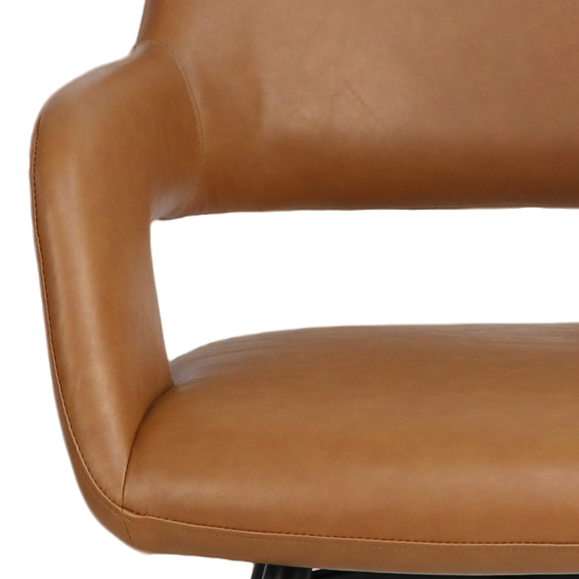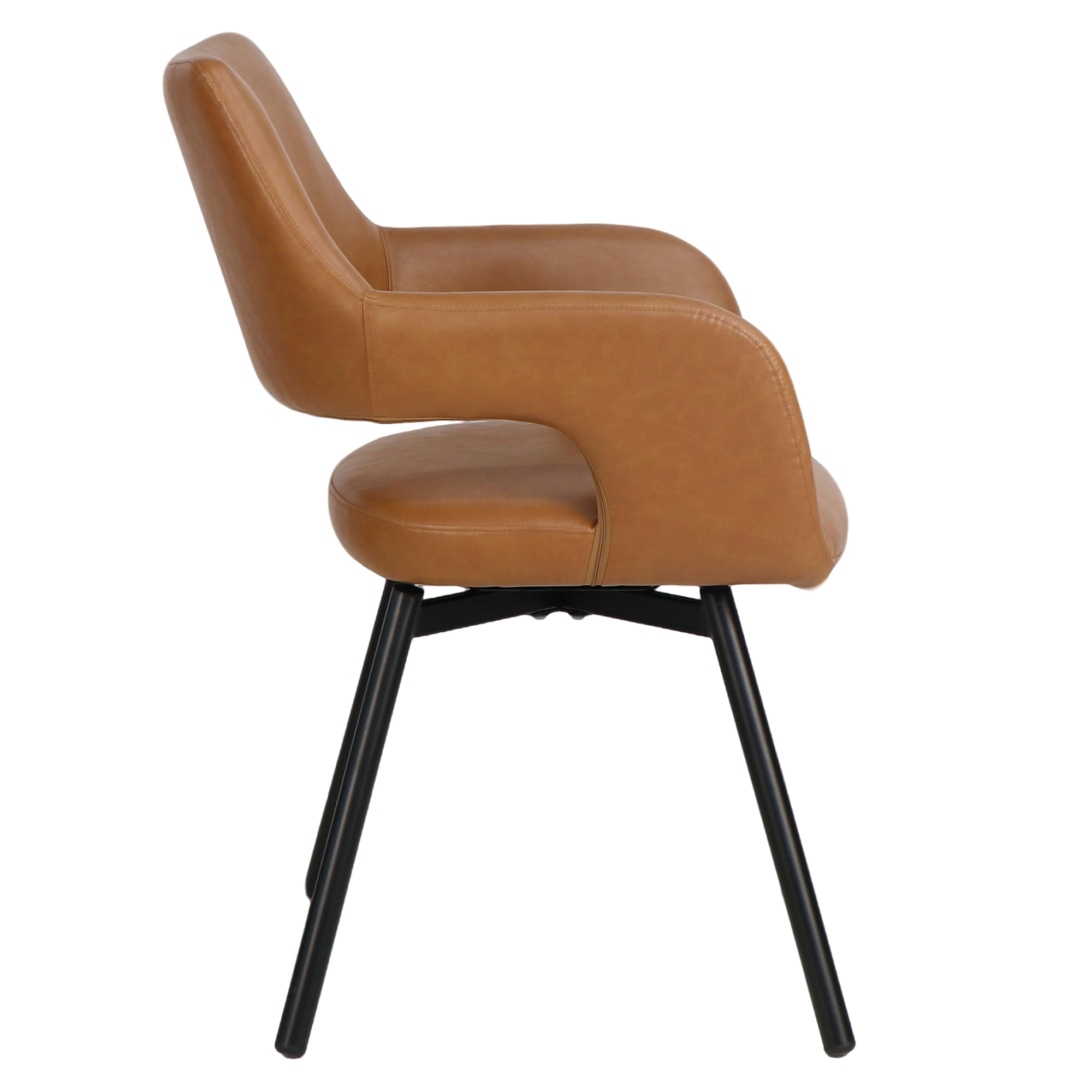 The return-swivel on this chair will kick up the design value of your space with every seated experience. Great as a dining chair, or as an accent piece in the living room or in a bedroom. The welded metal legs provide sturdy support and the contoured seat is comfortable and inviting. Faux leather upholstery is easy to wipe clean and the vintage finish adds a level of warmth. Warm, earthy tones and black metal legs combine to create the perfect modern boho-chic armchair.