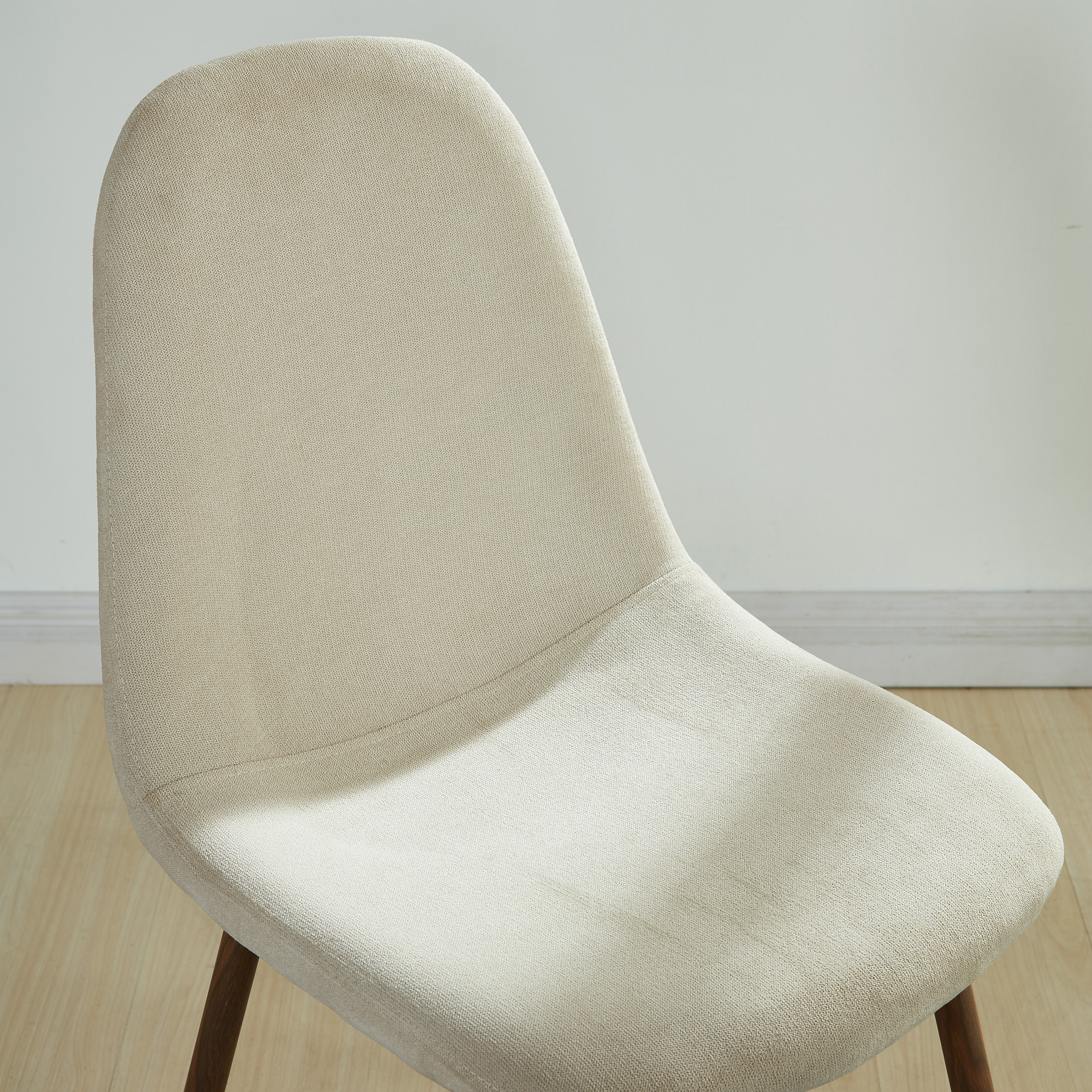 Incorporating a 10mm tempered clear glass tabletop on top of metal legs that have a walnut finish through the process of heat transferring, the illusion of crisscrossing geometric shapes makes this piece a conversation starter. Detailed with chrome-finished glass holders and table feet, this dining table seamlessly blends a fun and visually interesting appearance with a captivating style. This trendy chair showcases a sleek and coherent design. Composed of a comfortable, curved wood seat frame with foam covered in fabric upholstery this chair balances simplicity with style. Made with metal legs in a walnut finish through the process of heat transferring, this chair will boast sturdiness along with the sleek look and comfort.