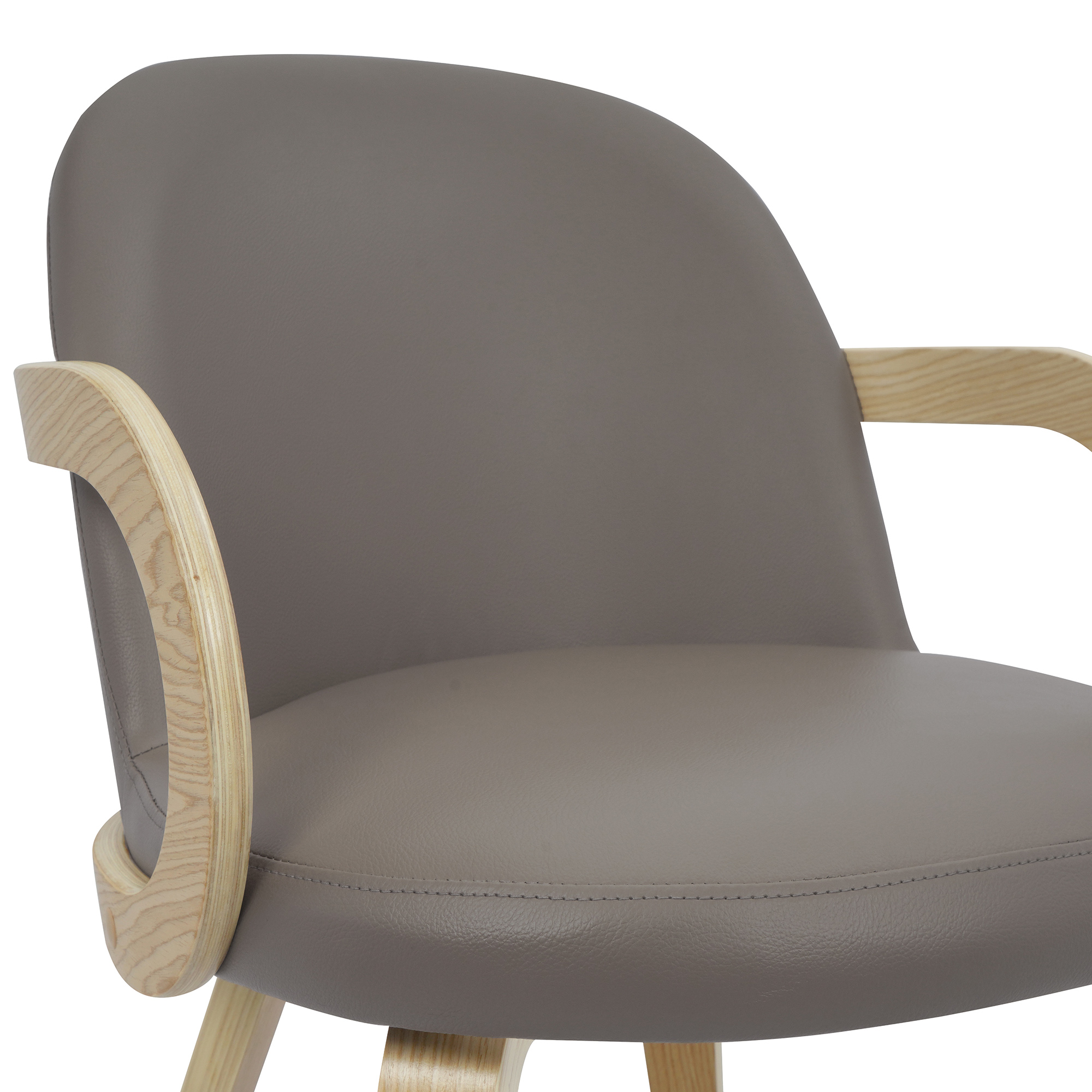 - Textured, dark taupe faux leather upholstery on chair back and seat