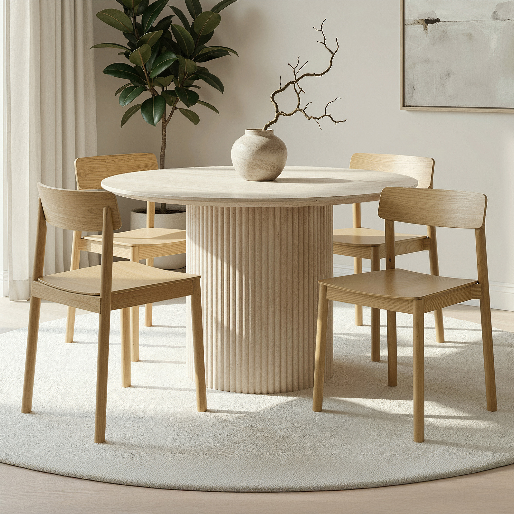 This statement piece will be the centre of attention in your home. The reeded finish on the pedestal is perfectly topped with a sintered stone top creating a refined piece that will elevate your carefully designed dining space. The tone-on-tone travertine finish is an easy match to various decor styles. Sturdy solid oak construction chairs come fully assembled and ready to use. Mid-century modern styling with oak veneer is an easy match for various décor styles. Comfortable curved back creates a trendy look and provides support. Stackable design makes it easy to store away extra pieces when not in use.