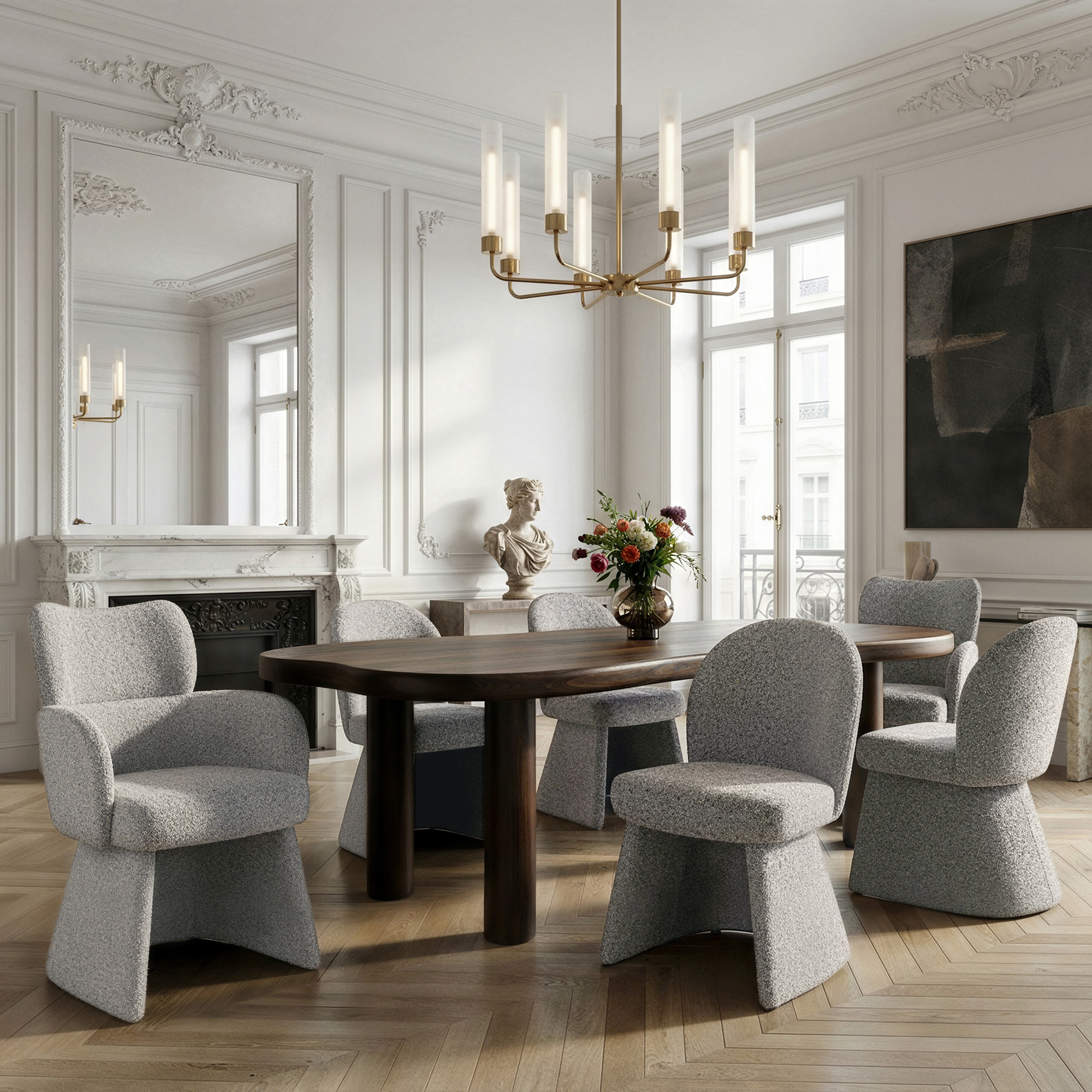This gorgeous and sophisticated table is meticulously crafted from sustainably-sourced, solid mango wood, providing a rich and sturdy foundation. The freeform, organic shape table top sits perfectly atop four thick post legs. Great for use in a formal or casual living space. This upholstered dining chair brings a simple silhouette to life - great for formal or casual dining room settings. The dimensional fabric upholstery covers the back, seat, and legs completely for a clean-lined modern look.