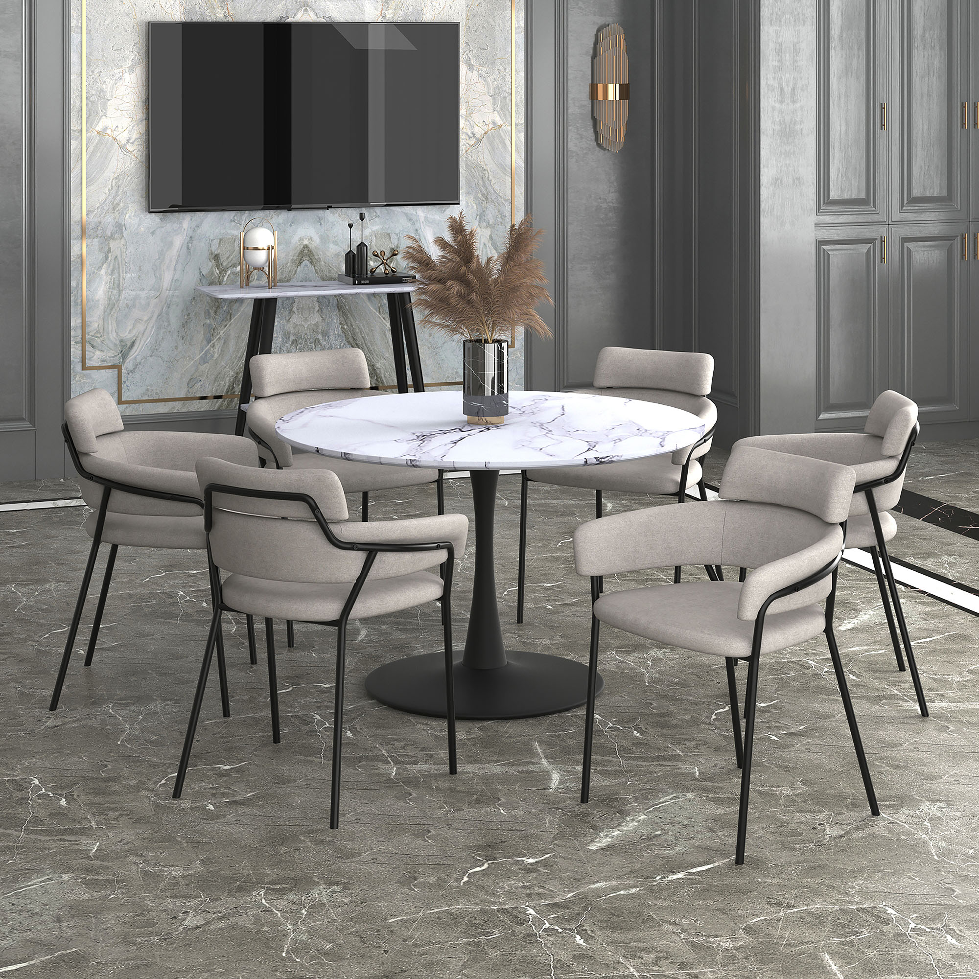 Zilo Round Pedestal Dining Table, 48" in White Faux Marble and Black