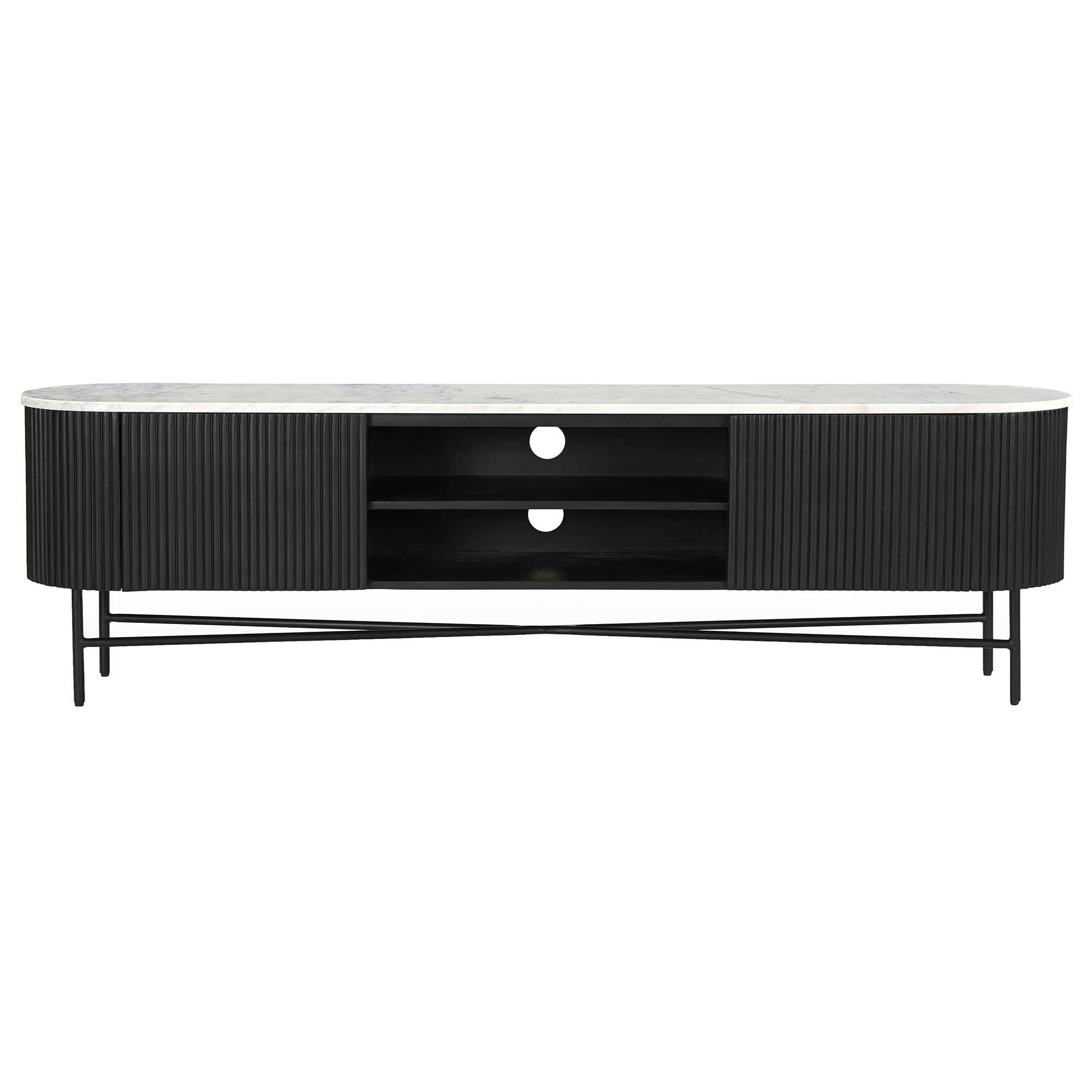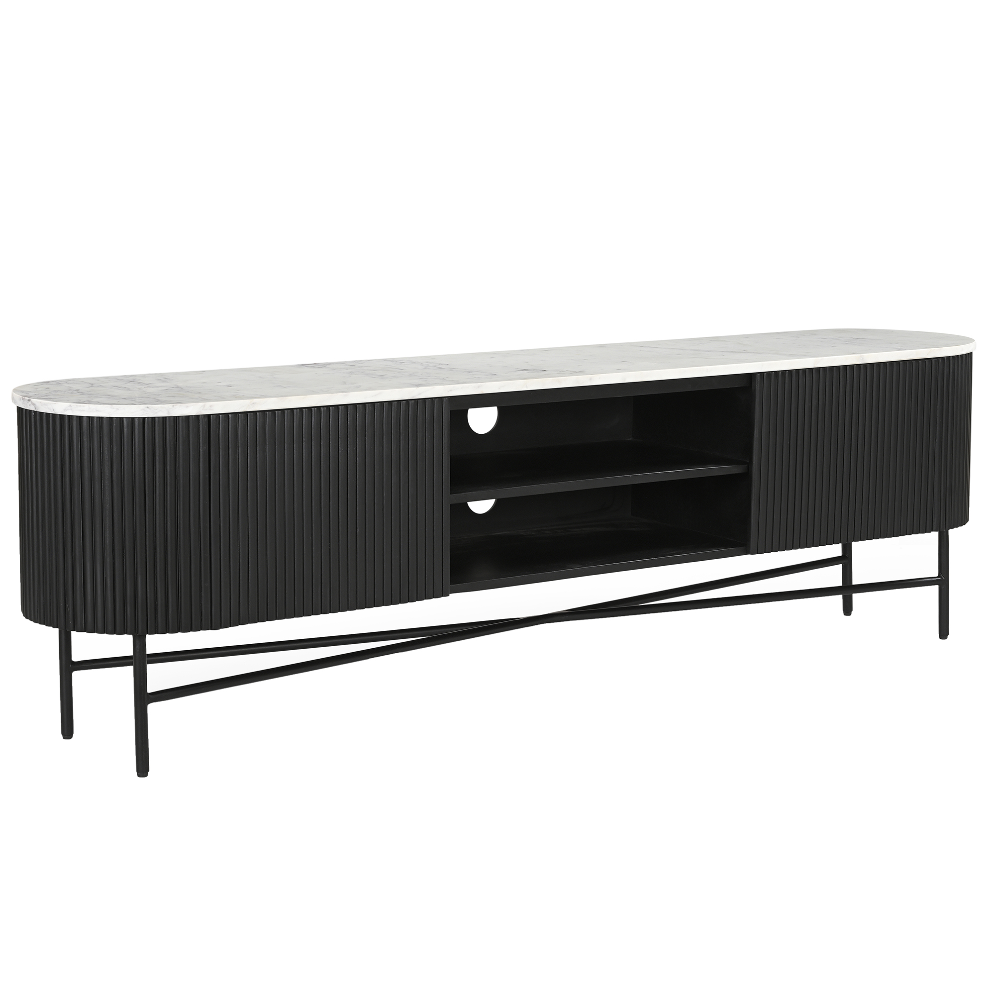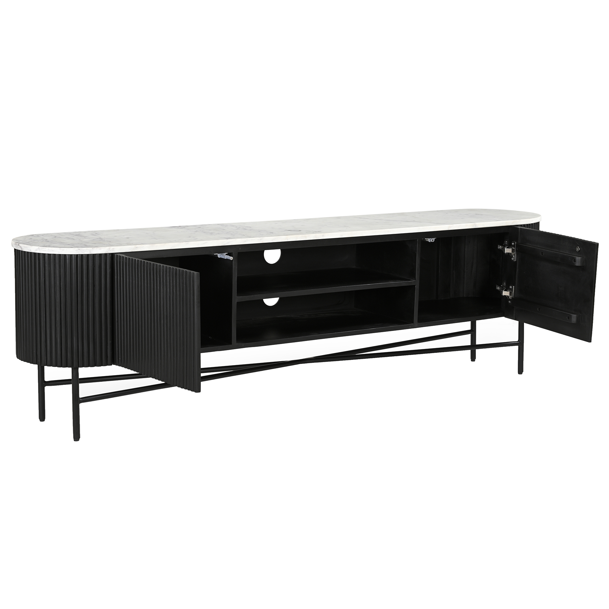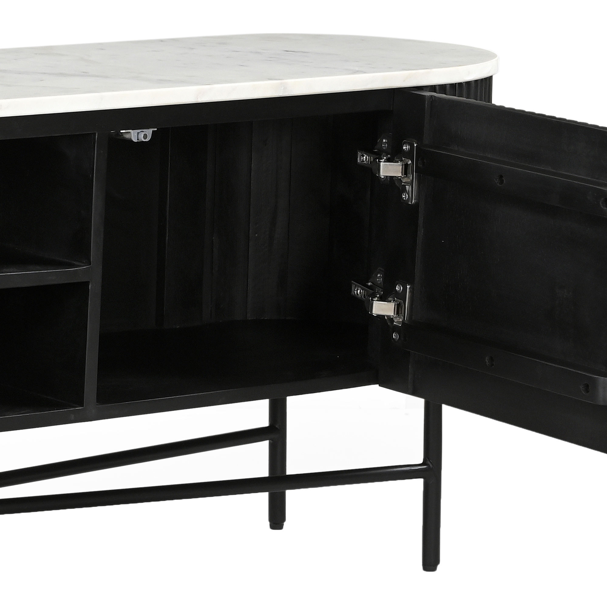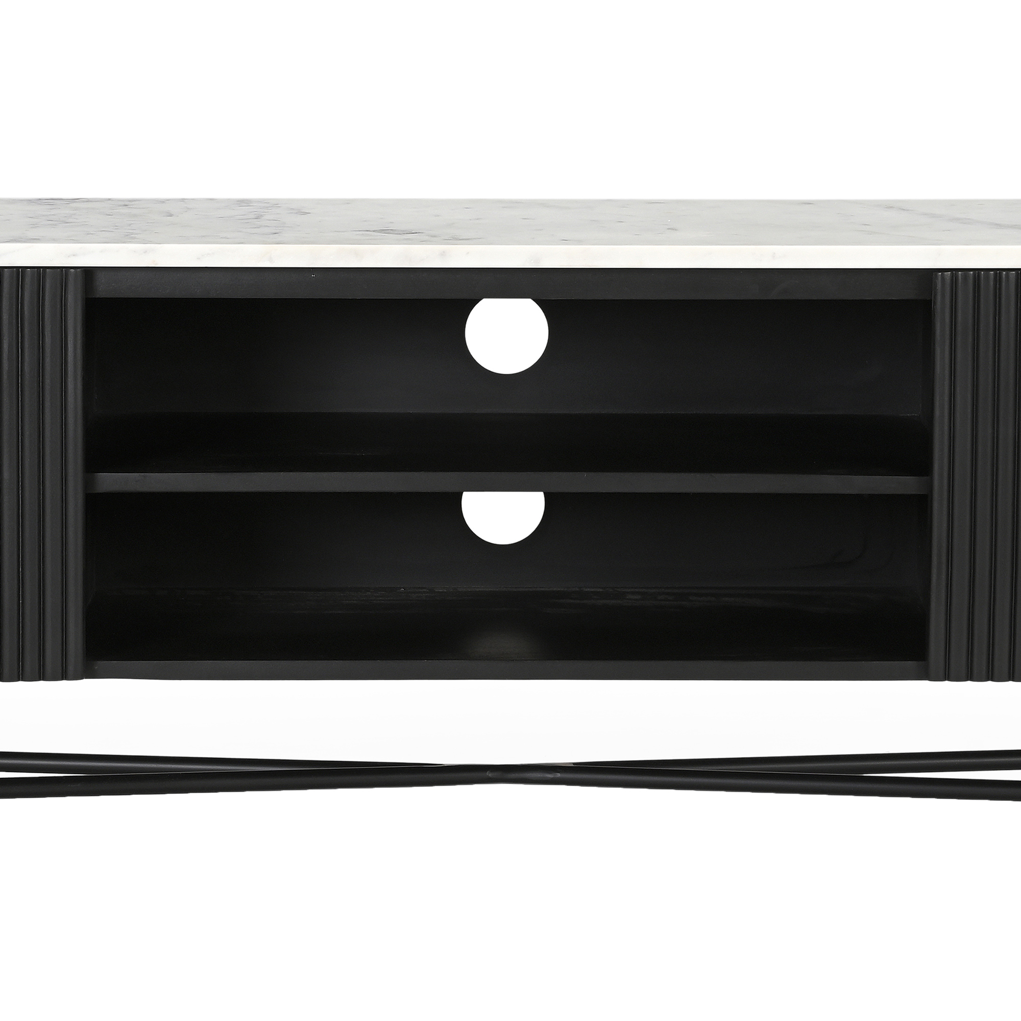 Stay organized with this stylish rustic modern media cabinet. The black-finished solid mango wood construction with white marble top and black metal base is the perfect centrepiece for any room. Keep it freestanding in a living room for storage and display, or use in a family room as a base for the tv - all the components can hideaway neatly in the open and closed storage. Holes for cable organization make it easy to keep it all clutter-free. No assembly required.